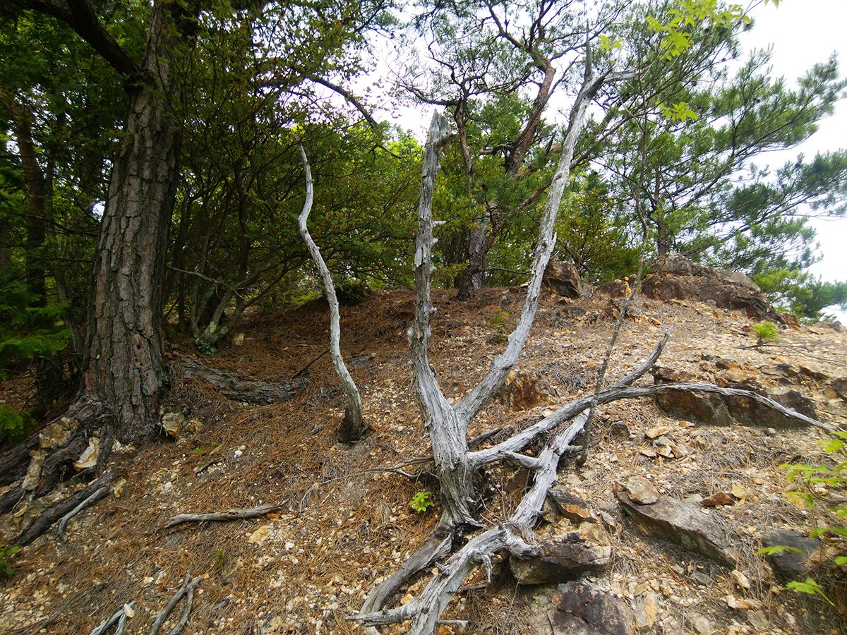 リハビリ登山の第二回目は滝畑付近にある奥立山に行きました。岩登りの練習場所の下見もかねて行きましたがやはりかなり体力が落ちていて、急登のバリルートでしたが息が切れました。岩登り自体は興味がないのですが、沢登りのためのロープの練習ができる場所でここがいい感じではないかと思いました。人もあまりいなくて、初心者にもビレイなどを教えることのできる岩場を見つけることができたのでよかったです。せっかくなので奥立山を目指して登りましたがルーファイに苦労して結構登るのに時間がかかりました。特に岩場をトラバースする地点はかなり迷いやすくて、どこで尾根に取り付くか考えさせられました。トラバースの途中で尾根に取り付けそうな場所があったのでそこを登って尾根に合流して山頂のほうへ登りました。山頂は何もない樹林帯の中でしたが、地図で確認すると奥立山のピークまで登れました。下山はどのルートをとるか考えましたが、そのまま少し戻って尾根を下ることにしました。おそらくゴジラ岩といわれる岩場で出て、下りのロープ場がありましたが、岩場の途中でこれ以上下るのは無理だと判断して一旦登り返しました。正直、その岩場の下りは細くてあのまま下っているとかなりヤバかったです。ルートを確認すると向かって左側に登山道があって、そこから下りました。沢筋に出る直前までは急斜面の下りになっていてかなりゆっくり滑り転ばないように注意しました。そして沢筋まで下って林道に戻って駐車ポイントへ無事戻ることができました。短時間の山行でしたが、いい岩登りの練習場所も見つけることができて、岩場の登り下りを満喫できたので十分満足することができました。