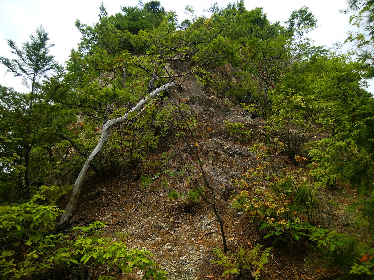 ゴジラ岩の向かって左側に登山道があったのでそこから下っていくが急斜面