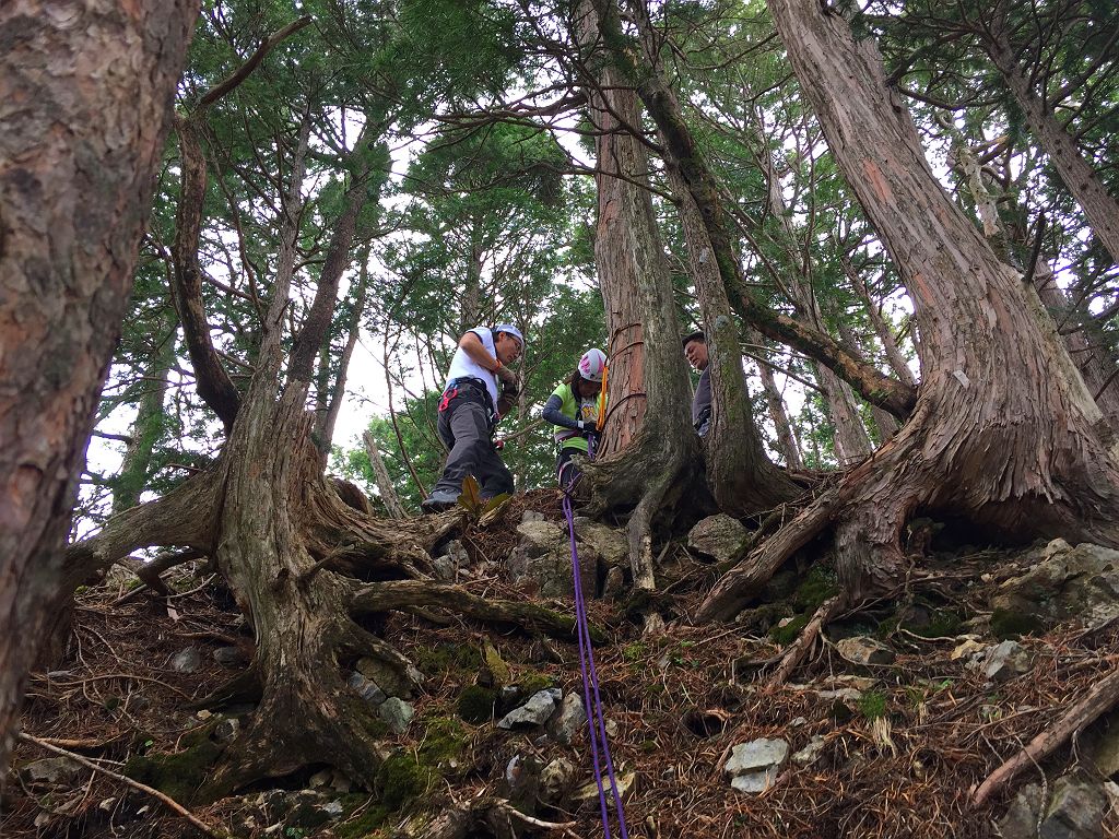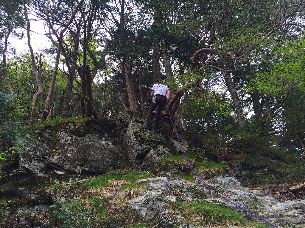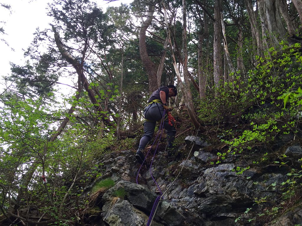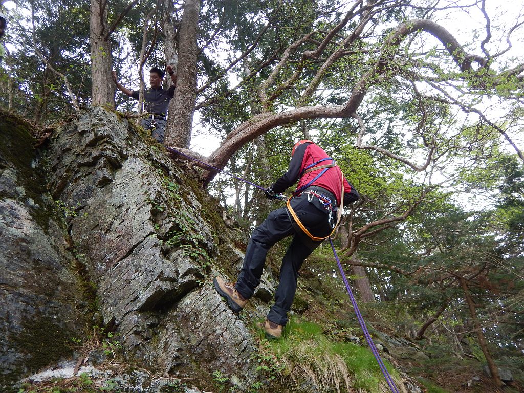 最後はちょっと斜度のあるいい懸垂下降の練習になる岩。私が最初にいかせてもらいました。セルフのスリングが・・・