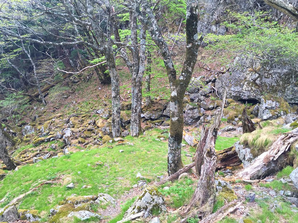 国見岳から下りきると苔地帯といいテント場になりそうな稚子泊。ここから七曜岳への登りになるのでちょい休憩