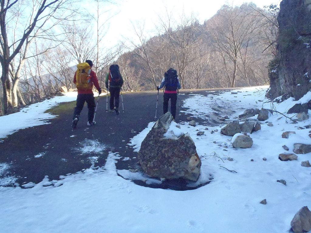土砂崩れ?で林道がふさがり車通行不可。仕方ないのでここから歩くことになった