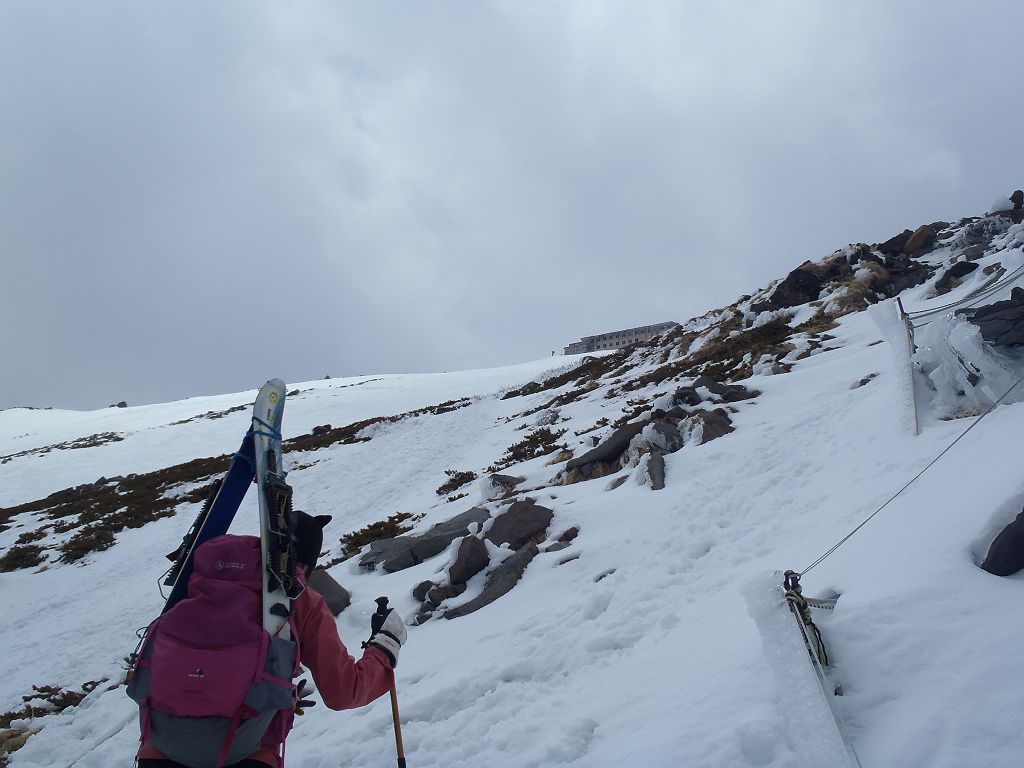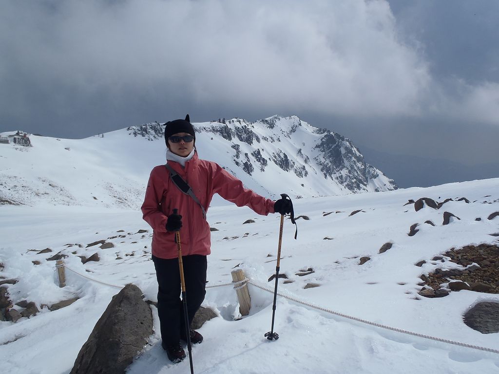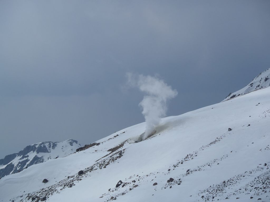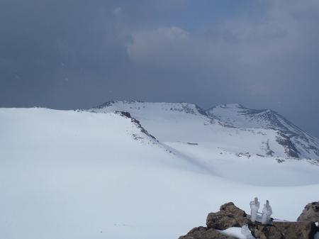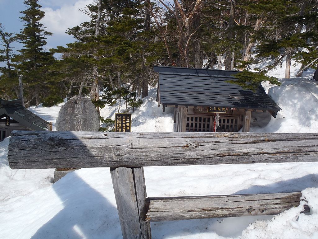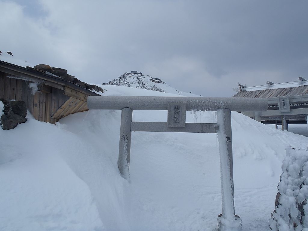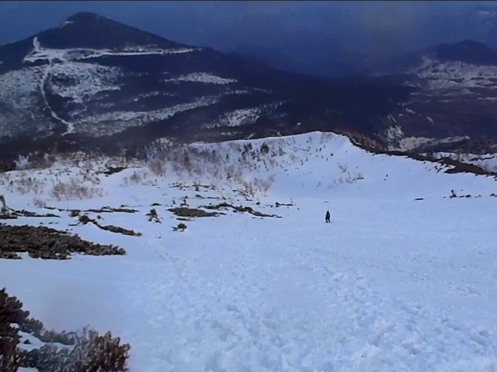 この日、予定では立山でまったり山スキーする予定でしたが、都合が悪くなって日帰りということになったので変更して御嶽山にいきました。独立峰で迫力ある山でスキーするのが最も大好きな3000m級の御嶽山。この迫力と快感をS嬢に味わってもらいたいと思ったのも一つ。ただ、前々日に田村君が空いてるということで同行、そして今回初の田村君弟も加わり4人になりました。予定としては3時間であるところをゆっくりのスローテンポでいって4時間の予定が、八合目~九合目、王滝山頂までのかなりの急斜面でシール歩行が思うようにいかず1時間30分ロス。王滝山頂より日没までは下山できそうだったので荷物をデポして剣ヶ峰へピークハント。下山時に王滝山頂で雪が降ってきて視界が悪くなったのでヤバイと思いながらも滑走スタート。視界が消えてもシュプールやトレースもあるし左の稜線沿いにいけば道迷うといった心配はなかったんですが、誰かがコースアウトしたりしないか心配だったので見失わないようにゆっくり滑走。と思いきや5分もすれば一発で青空がでてきて視界良好。ここから楽しいスキーの始まりでした。雪質はバッチリ!超最高の滑りでした。ヒーヒー言いながら何時間もかけて登っていたところを数分で滑ってしまうのは惜しいですが、この滑りのためにあります!40分程度で金剛童子が見えてきてそこからはスキーを脱いで歩行。結局王滝山頂から田の原までは50分程度で下山できました。そこからはスキー場を滑走して駐車場までいきました。田村君と田村君弟は初の3000m超えだったようで、登頂できて、かつあの迫力の中、快感の滑走ができてよかったです。