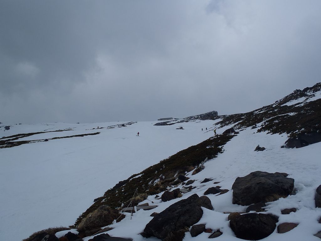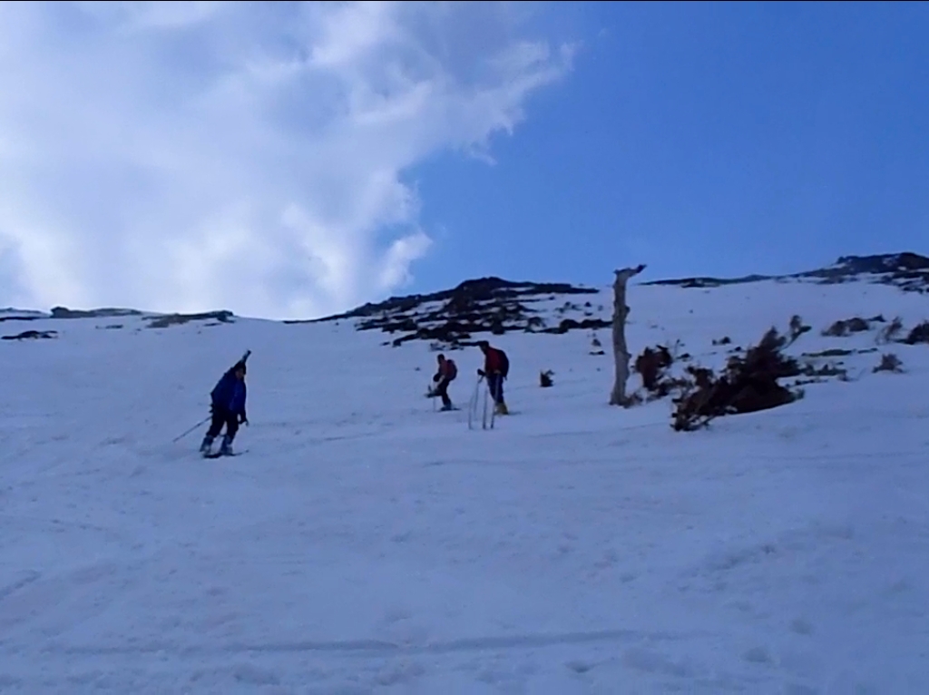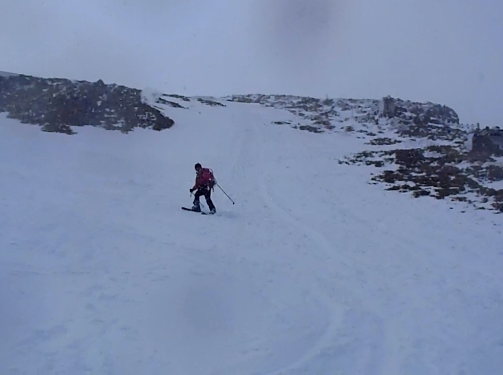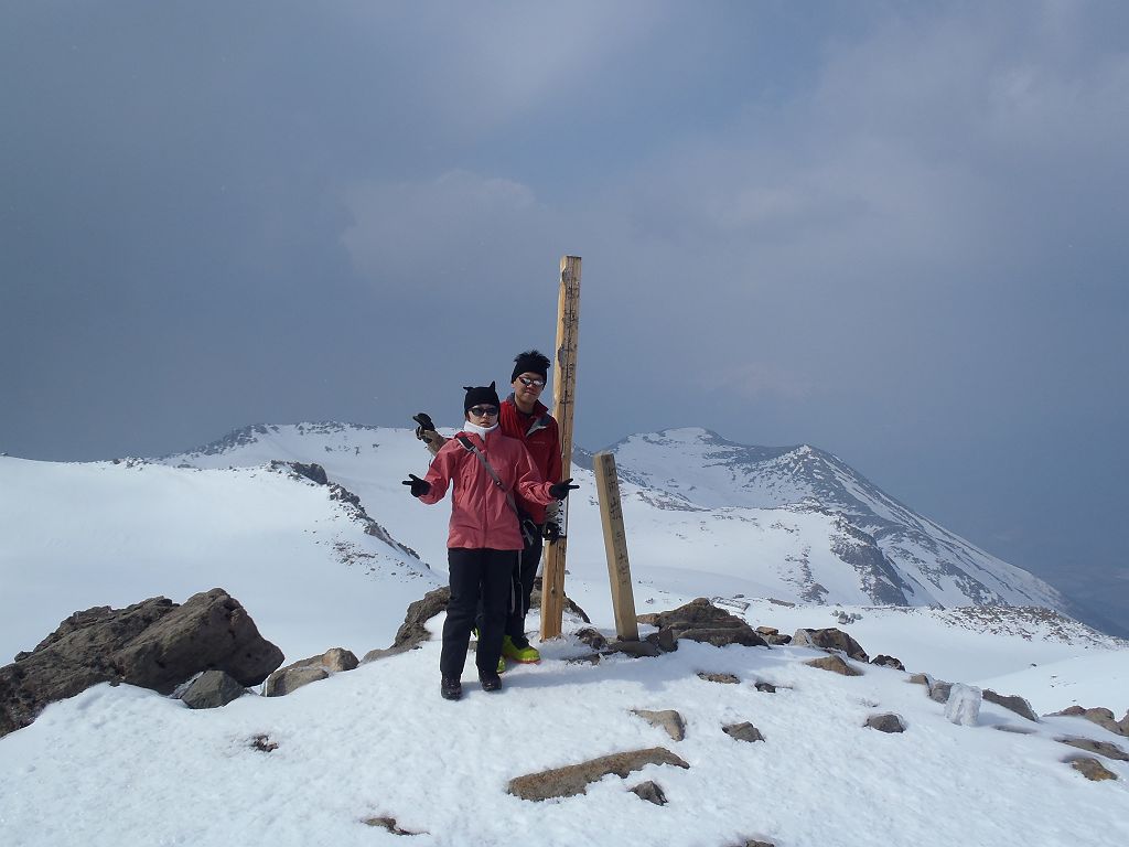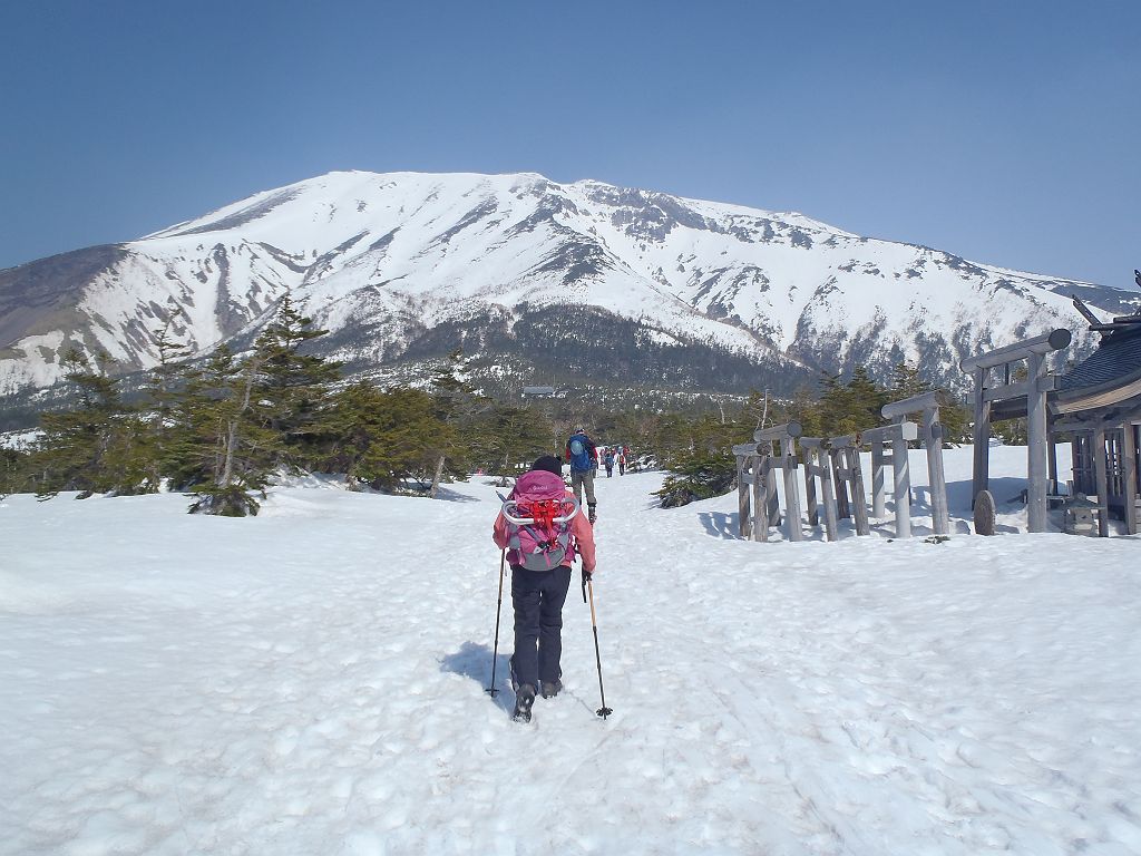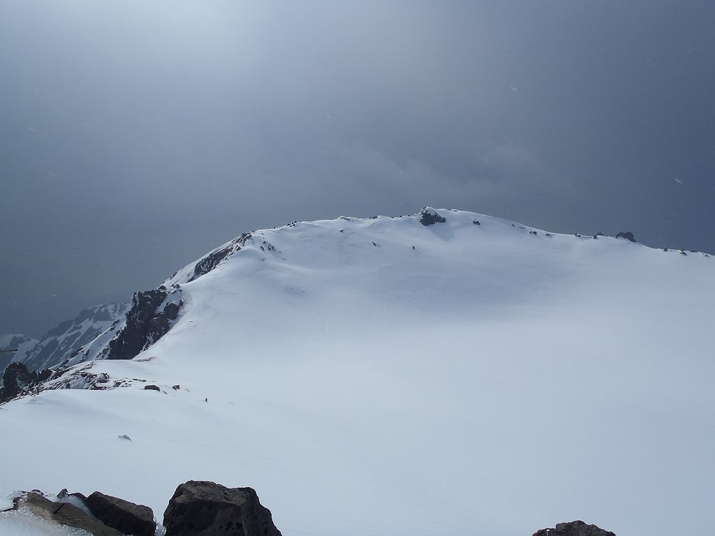 この日、予定では立山でまったり山スキーする予定でしたが、都合が悪くなって日帰りということになったので変更して御嶽山にいきました。独立峰で迫力ある山でスキーするのが最も大好きな3000m級の御嶽山。この迫力と快感をS嬢に味わってもらいたいと思ったのも一つ。ただ、前々日に田村君が空いてるということで同行、そして今回初の田村君弟も加わり4人になりました。予定としては3時間であるところをゆっくりのスローテンポでいって4時間の予定が、八合目~九合目、王滝山頂までのかなりの急斜面でシール歩行が思うようにいかず1時間30分ロス。王滝山頂より日没までは下山できそうだったので荷物をデポして剣ヶ峰へピークハント。下山時に王滝山頂で雪が降ってきて視界が悪くなったのでヤバイと思いながらも滑走スタート。視界が消えてもシュプールやトレースもあるし左の稜線沿いにいけば道迷うといった心配はなかったんですが、誰かがコースアウトしたりしないか心配だったので見失わないようにゆっくり滑走。と思いきや5分もすれば一発で青空がでてきて視界良好。ここから楽しいスキーの始まりでした。雪質はバッチリ!超最高の滑りでした。ヒーヒー言いながら何時間もかけて登っていたところを数分で滑ってしまうのは惜しいですが、この滑りのためにあります!40分程度で金剛童子が見えてきてそこからはスキーを脱いで歩行。結局王滝山頂から田の原までは50分程度で下山できました。そこからはスキー場を滑走して駐車場までいきました。田村君と田村君弟は初の3000m超えだったようで、登頂できて、かつあの迫力の中、快感の滑走ができてよかったです。