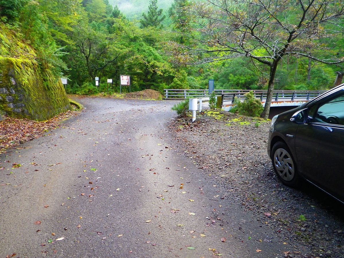 橋を渡って左側の路肩に駐車してスタート。登山口はこれを直進する