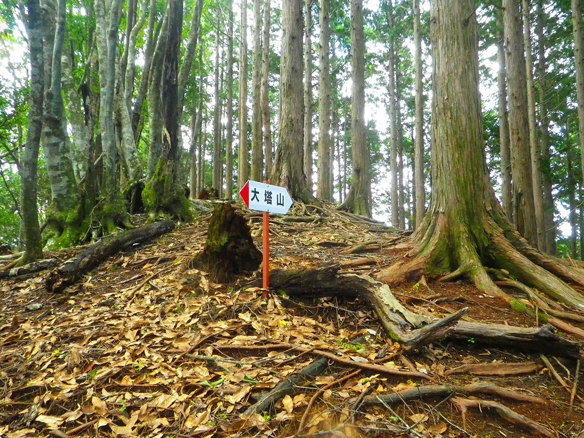 この付近から大塔山への道標の看板が出てきた。ここを右へ尾根道を進んでいく