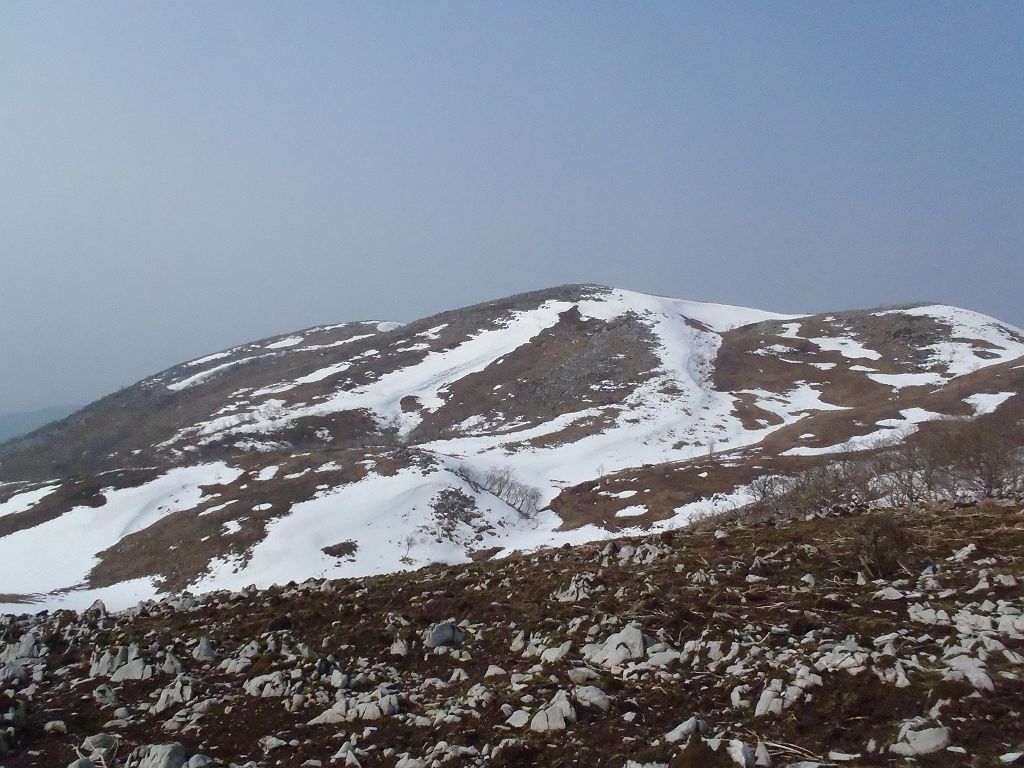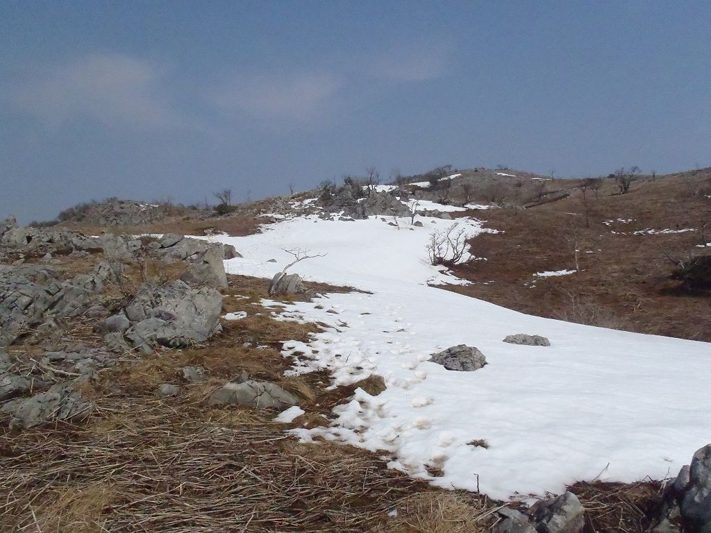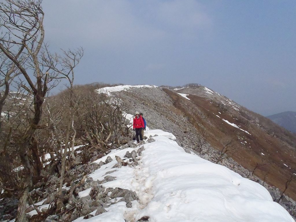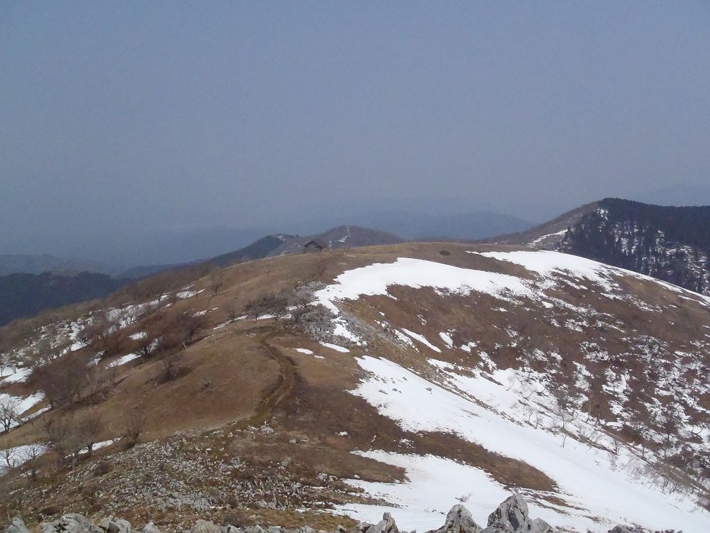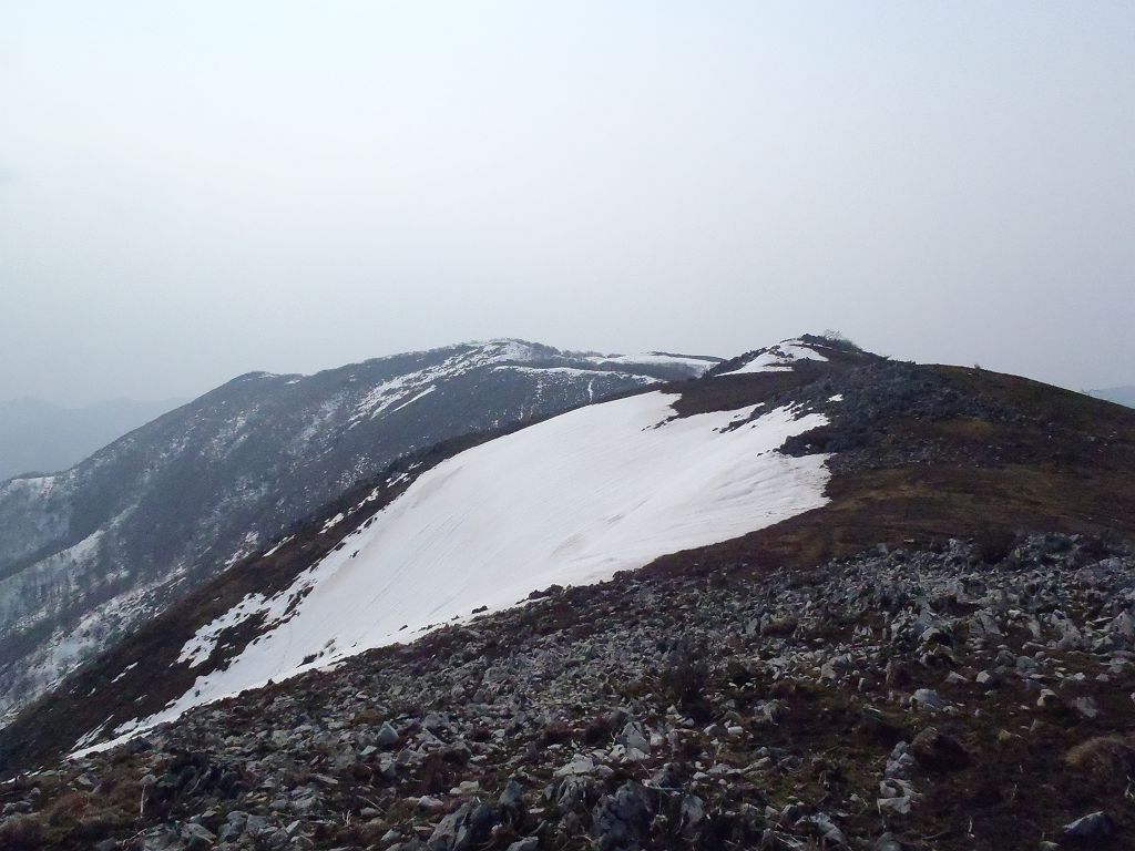 伊吹山の横にある鈴鹿の霊仙山は以前から気になっていたのですが、なかなかいけずに前日のいきなりの誘いがありいくことになりました。今回は女性も含めてのことなので、ちょっと心配な感じがしましたが、結構イケイケな感じの人だったのでよかったです。登山道は雪解けの泥だらけで重かったところもありましたが展望は良し。ただ、かなり霞んでいたので周りの山々は見えにくかったです。しかし、7合目にいくとまるで別世界!その景観はまるで北アルプスのようでした(乗鞍岳や御嶽山、白山によく似た感じでした)。残雪っていうのがおそらくさらに魅力を引き出していたんだと思いますが関西でこんな景観が見れるところがあるなんてびっくりでした。飯くっていよいよ稜線歩きですが、これがグッドな景色みながらなのでまた気持ちいい!!しかし、ところどころ岩と岩の間にずぼずぼハマってこれに注意を払いながらだったのでここで結構時間ロス。しかも体がもっていかれそうな風が吹き始めました。笹峠までたどり着いて沢の登りかえしを少しでも回避しようと、破線部分のルートにいったら、泥地獄。泥で滑る滑る状態で、3人とも泥だらけに危ないと判断してそこを登りかえすことに・・・なんかおおちゃくしようとすればこういう目にあってるような^^;結局正規ルートで今畑登山口まで下山。問題はまたそこからでした。歩いているおじさんに、落合ルートは荒れていると聞いていましたが、最初はこんなもんかと思いきや、相当な荒れようであれこれ考えながら進むしかありませんでした。最悪左側に尾根が見えていたので最悪のシナリオとしては尾根に無理矢理直登も考えてはいましたがなんとか汗拭峠に戻れました。結構、霊仙山はあなどっていた部分がありましたが、この周回ルートは結構なもので、この山行は先週の釈迦ヶ岳に引き続き波乱万丈でした。
