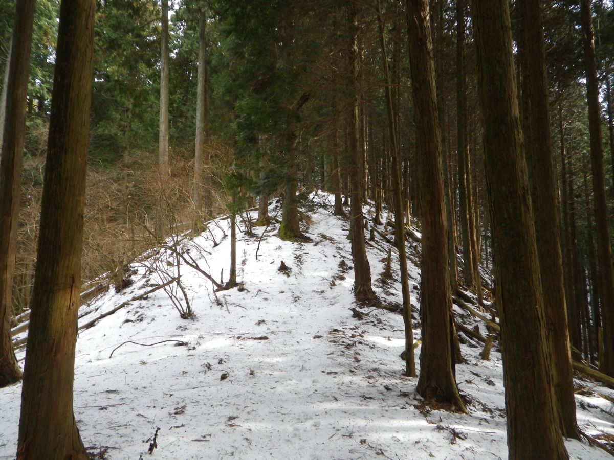 尾根道はなだらかだけど雪がパリパリに凍ってて時々滑る。アイゼン装着するにも中途半端な感じだった