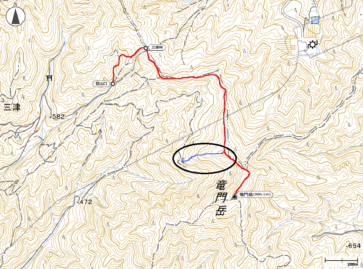 竜門岳山頂(904.3m)に到着。山頂には何か祀られているだけで展望も何もないただのピークって感じだった