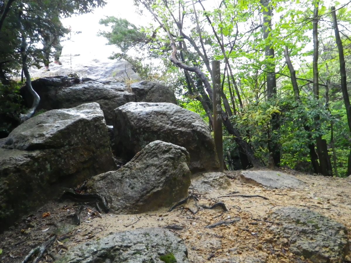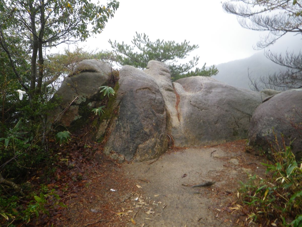 この付近からは下が岩場の登山道になる。雨が降ってるし滑らないように注意しないといけない