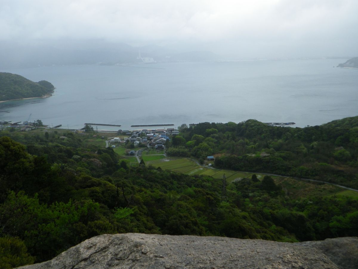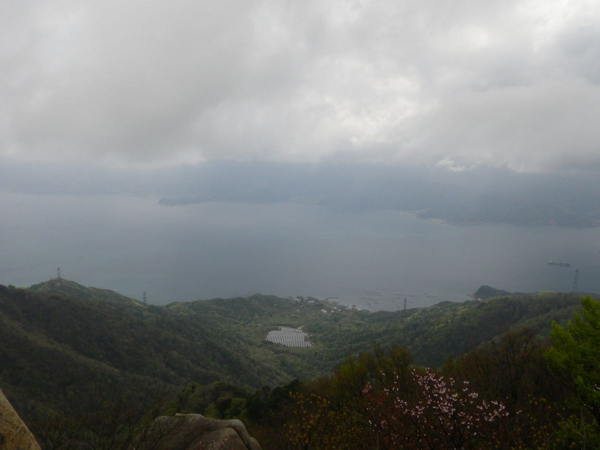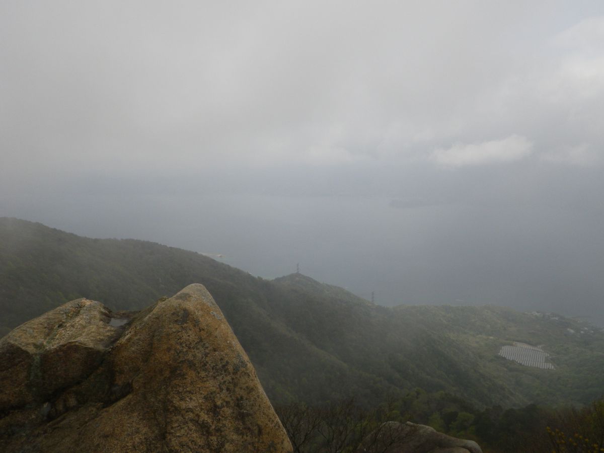 雨でガスっているけど、まだこの標高なら海が見えてる。しかし標高はまだ低いのでどんどん登っていかないといけない