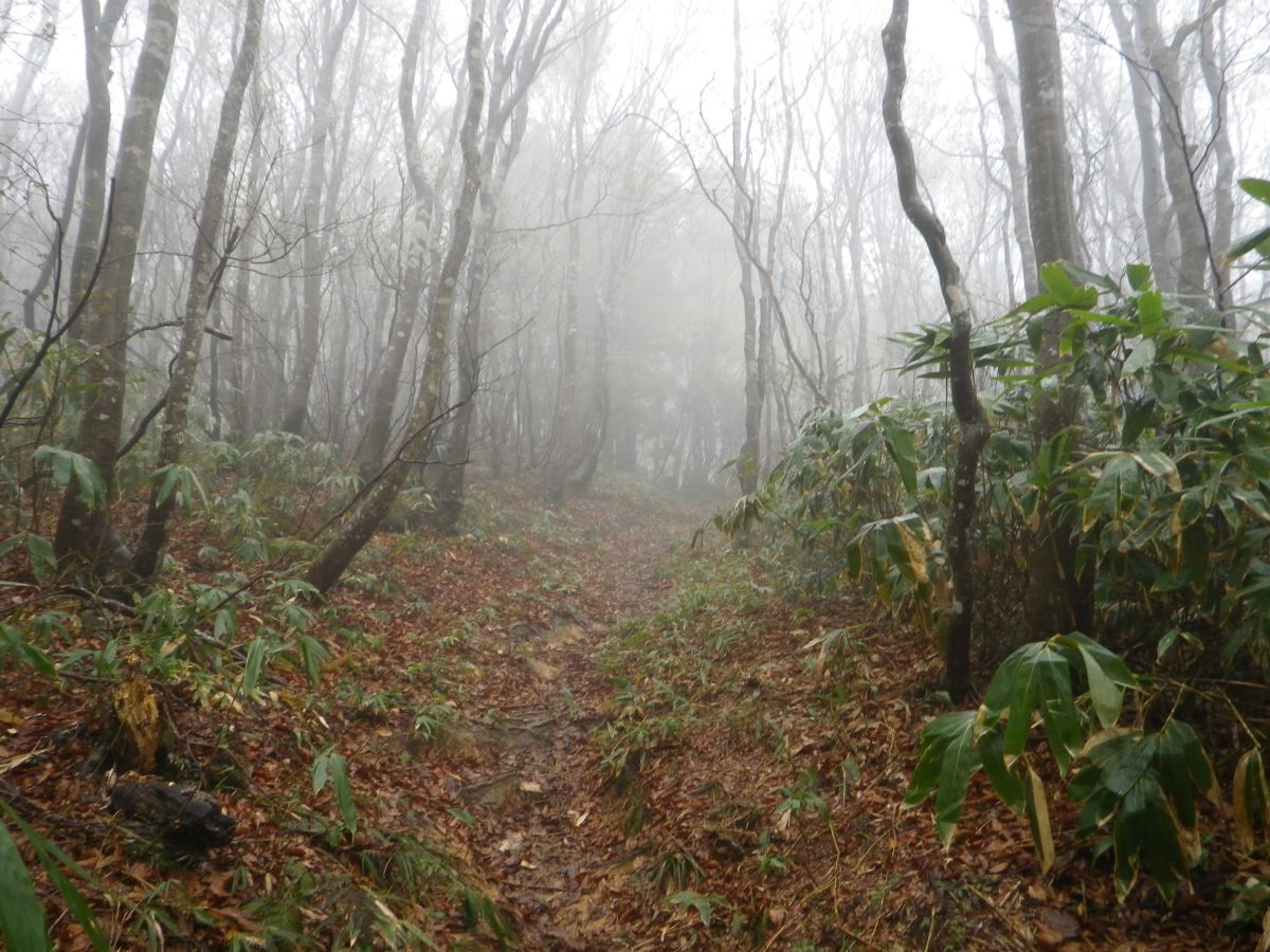 P580のピークを過ぎて、いよいよ西方ヶ岳への登りになった。雨が降ってるしガスってるので展望はもう諦めモード