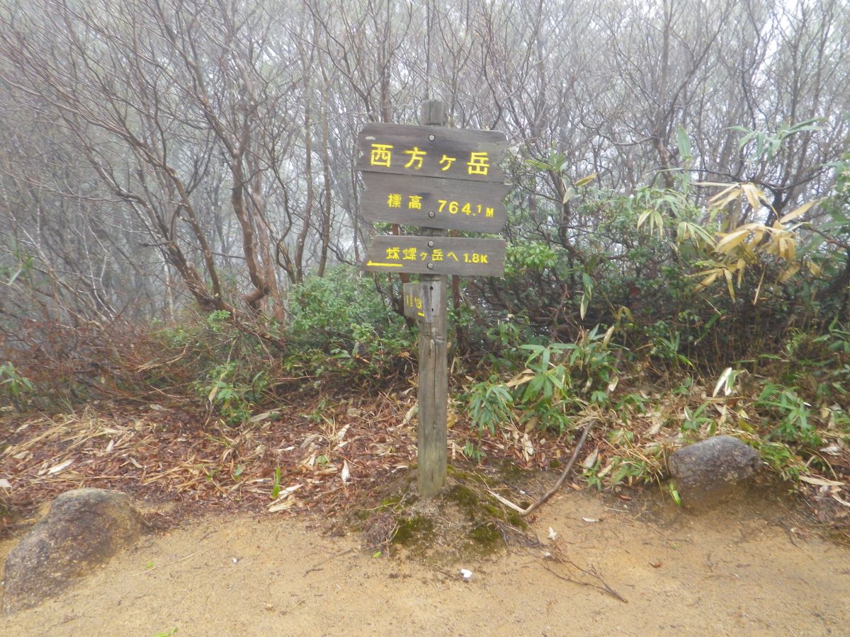 西方ヶ岳(764.1m)に登頂。次の目的地である蠑螺ヶ岳までは1.8kmらしい。ここで止まっていると寒いのでこの左側にある避難小屋に入ることにした