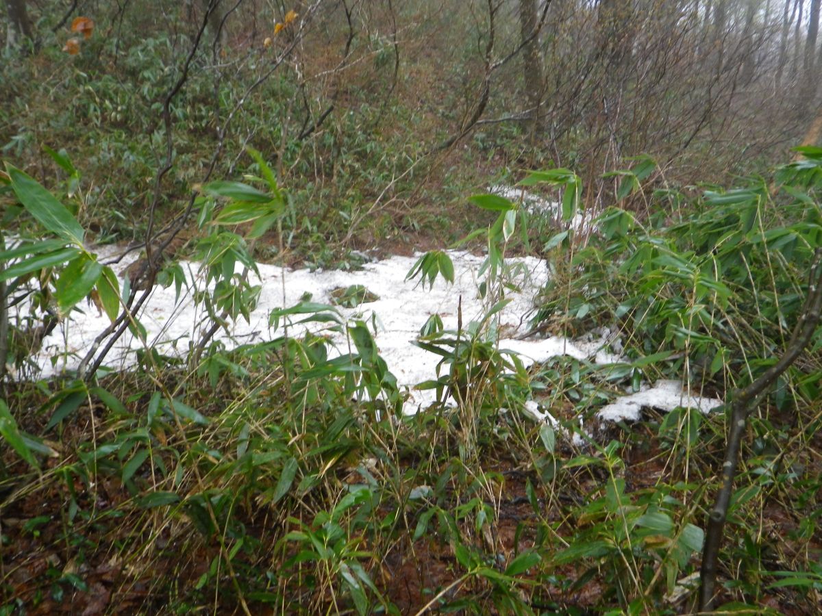 まだ日陰になっているところは残雪があった。雨が降っているのになかなかとけないのね