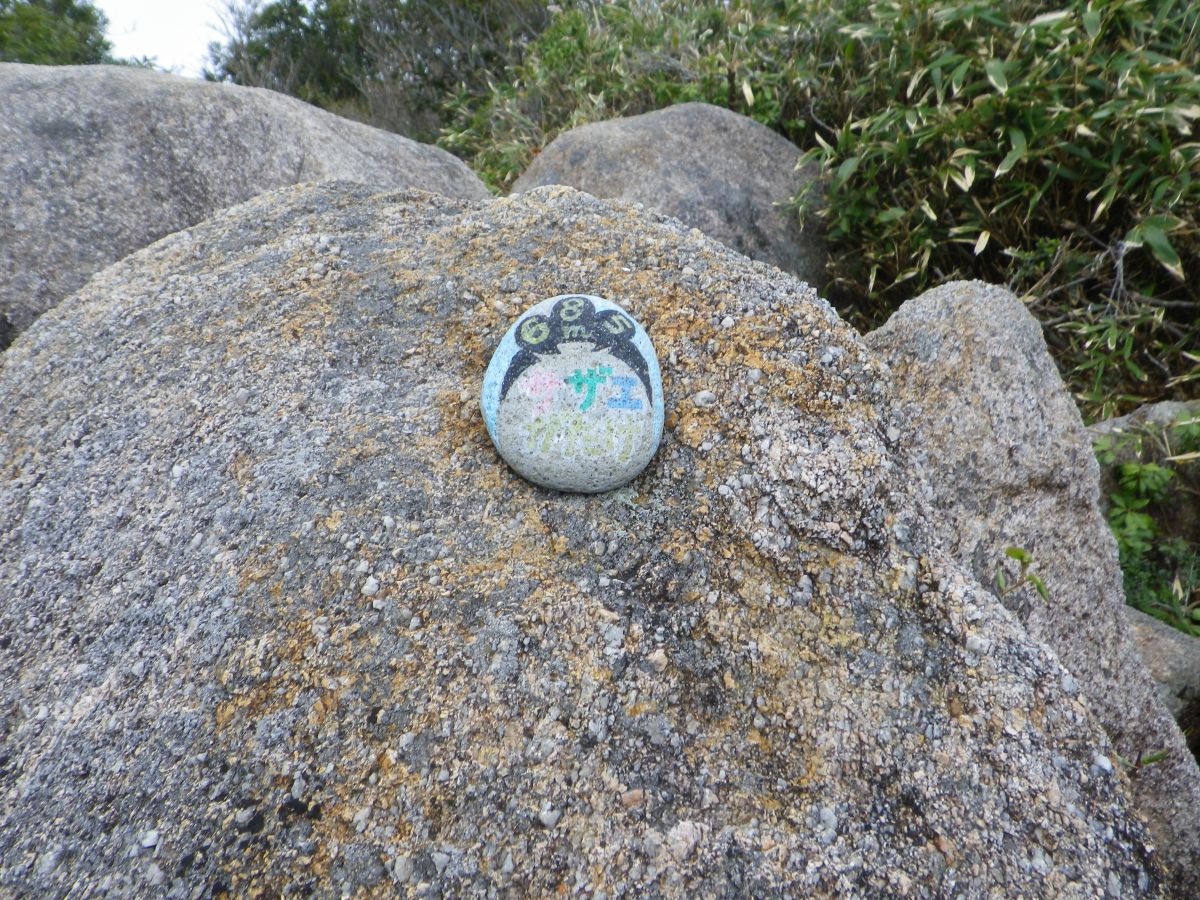 蠑螺ヶ岳の山頂の岩上に絵が描かれた石が置いてあって、最初は何かわからなかったけど、これってアニメ、サザエさんの頭だということがわかった