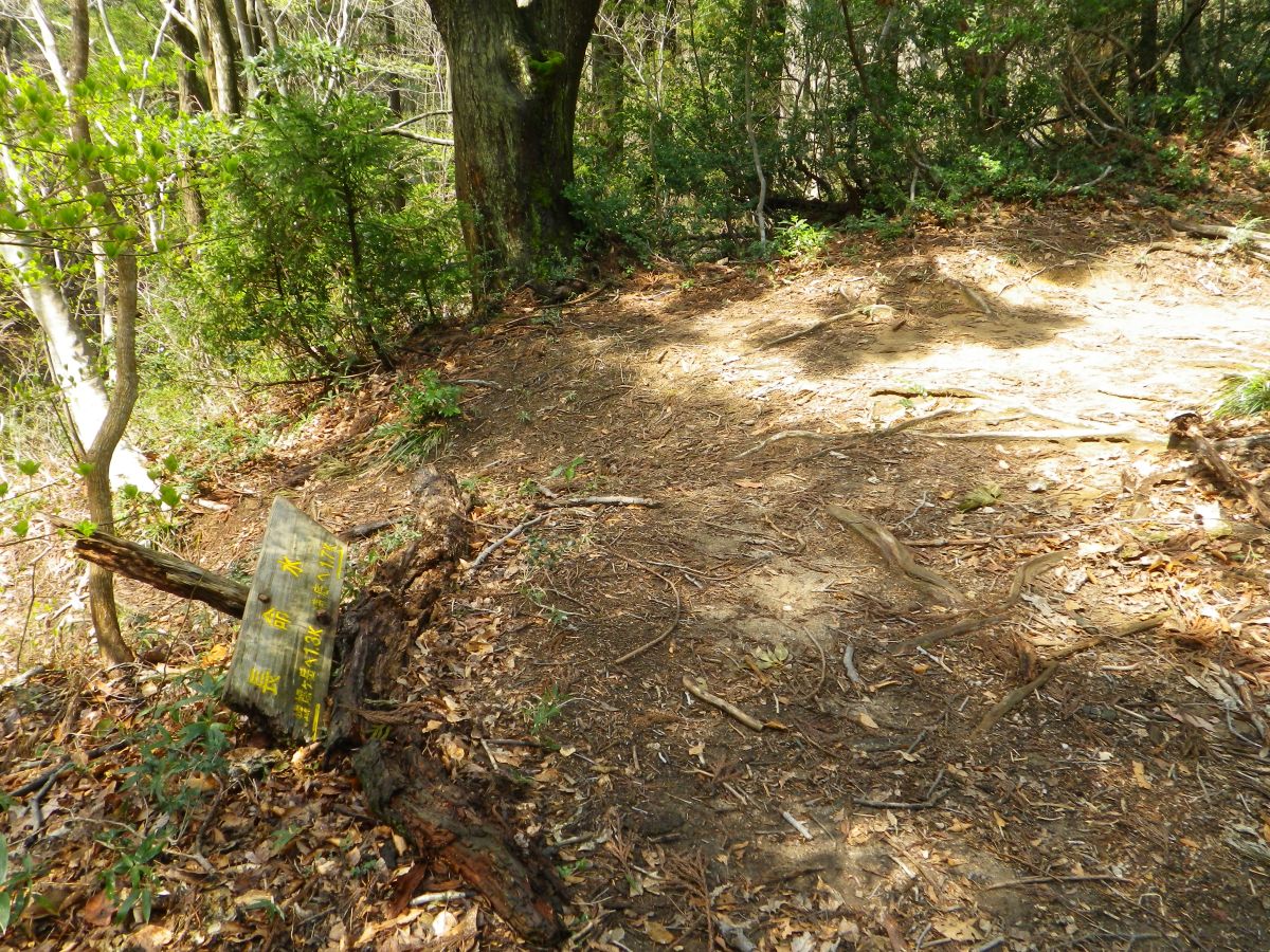 浦底登山口の入山口まで下ってきた。登山口は道路かららしいけど距離的には蠑螺ヶ岳の山頂からここまでが3kmなはず。ここを左にいって道路へ出る