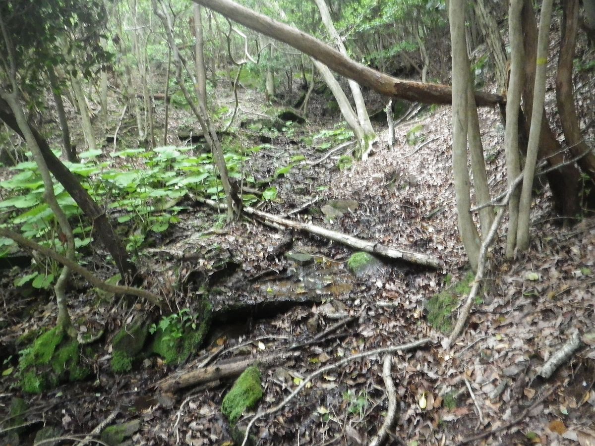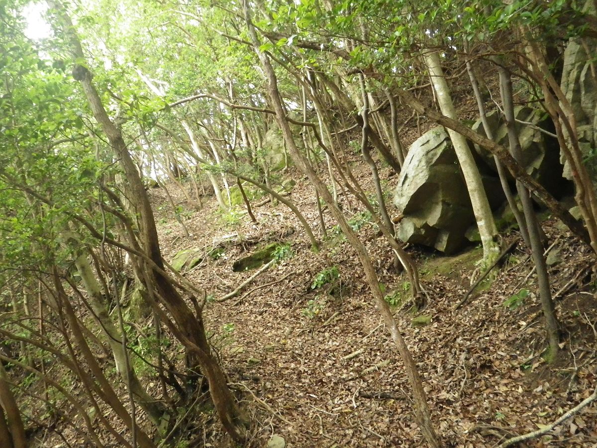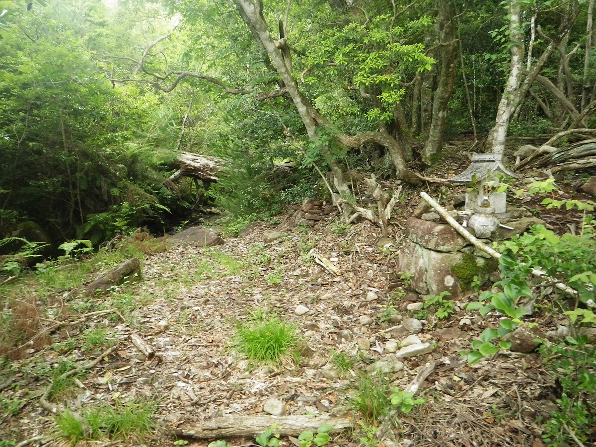 分岐を左にいくと祠のようなものがあって行き止まりのように思えたが、右側から巻いて進んでいくとわずかな踏み跡があった