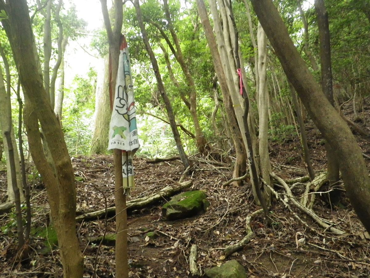 ルーファイを続けていると比較的新しいピンクテープを発見したので、それを辿りながら登っていくと旗のようなものがあった