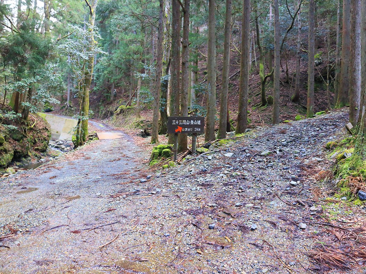 三十三間山登山道入口。ここが倉見登山口。立派な看板とトイレと駐車場がある