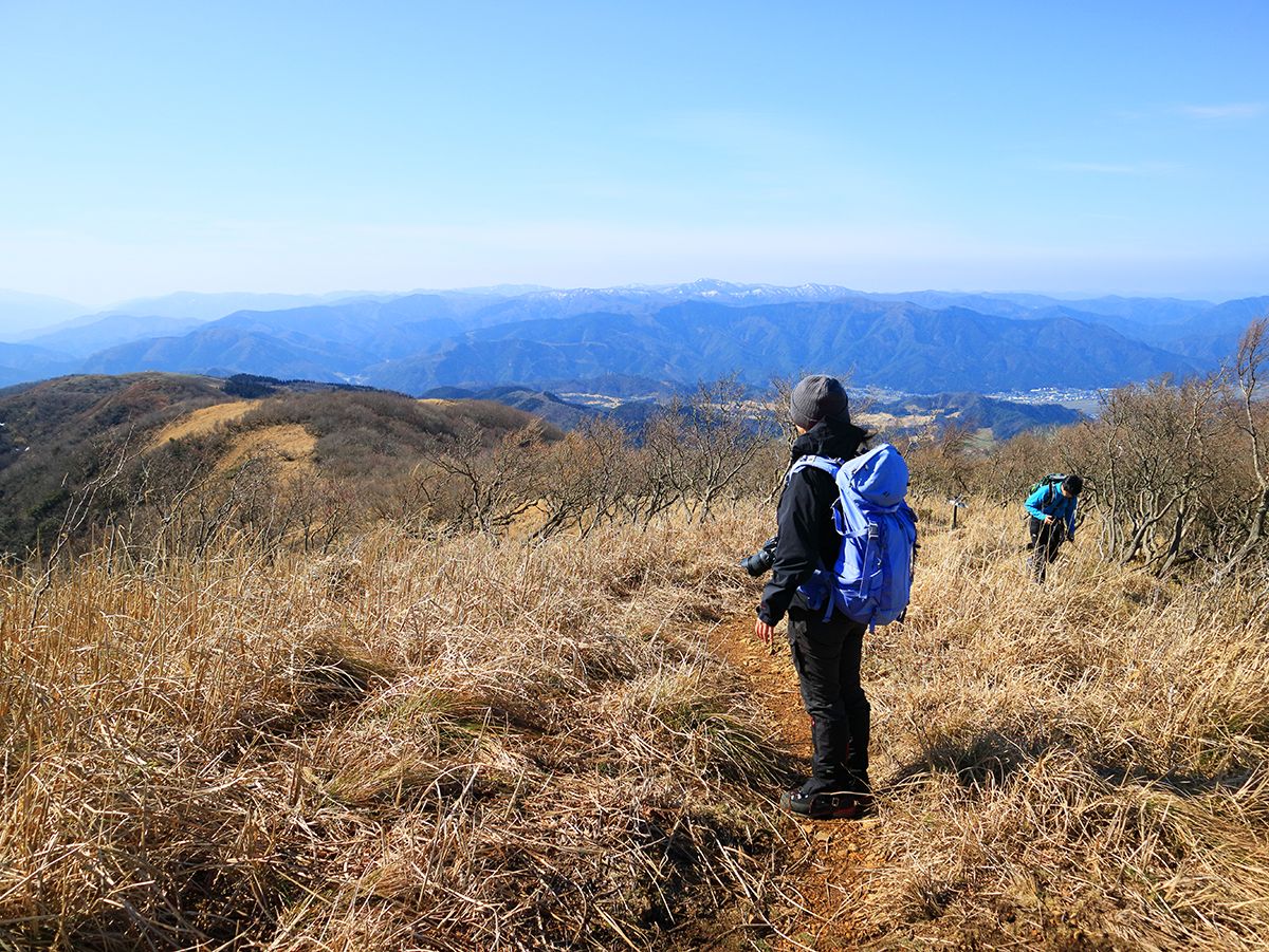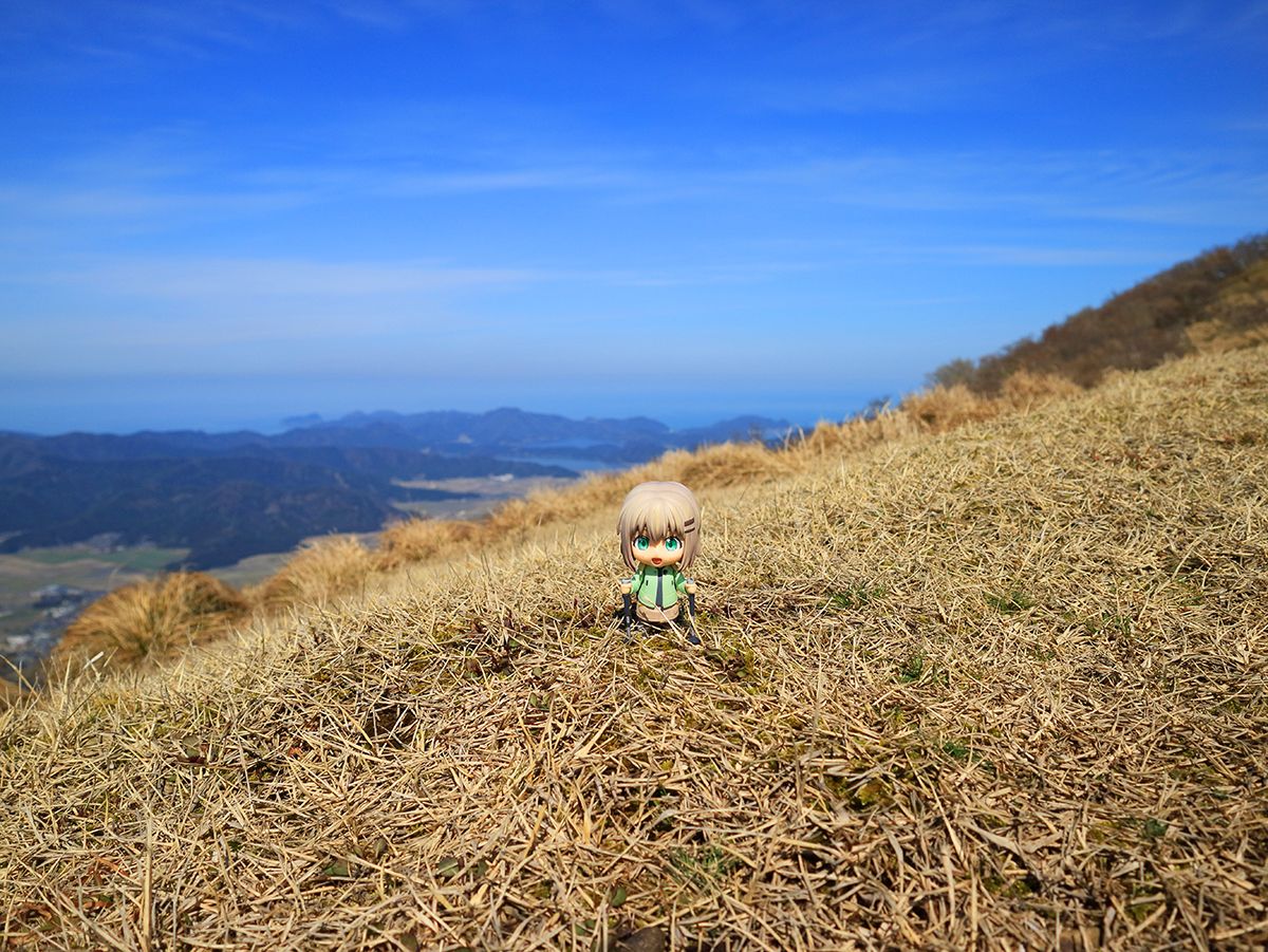 尾根の合流から少し歩くと展望の良い芝地になる。こまっちゃんが絵になると思ったので撮影しておいた