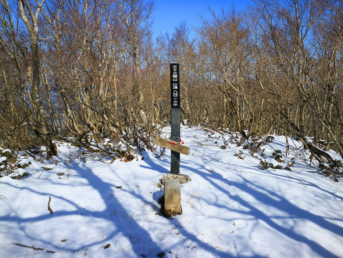 三十三間山山頂(842.3m)に到着。山頂は三角点があるだけで展望も何にもなかった