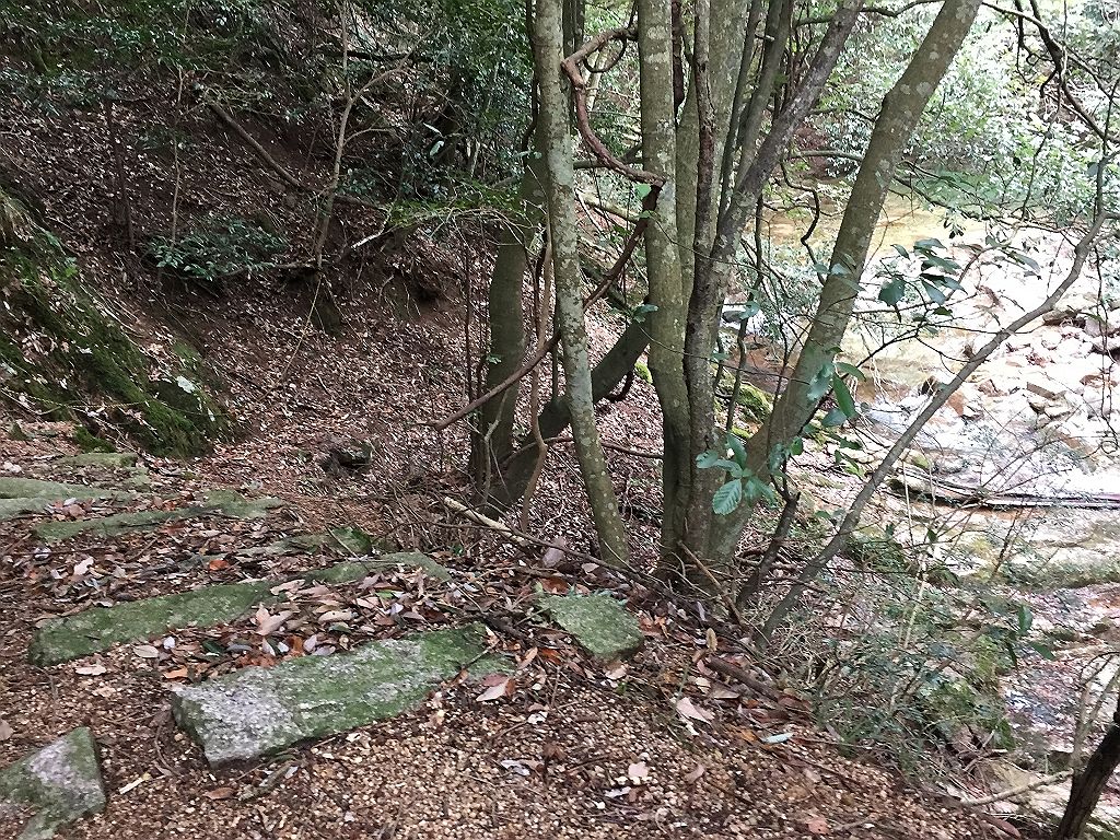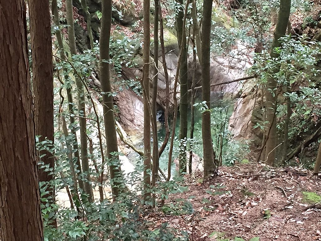 この橋は乗ってみたが信用ならず、うまく岩や根っこを掴んで巻いた