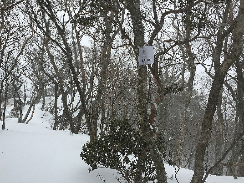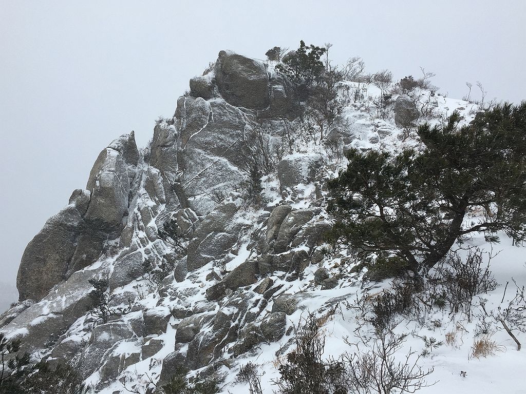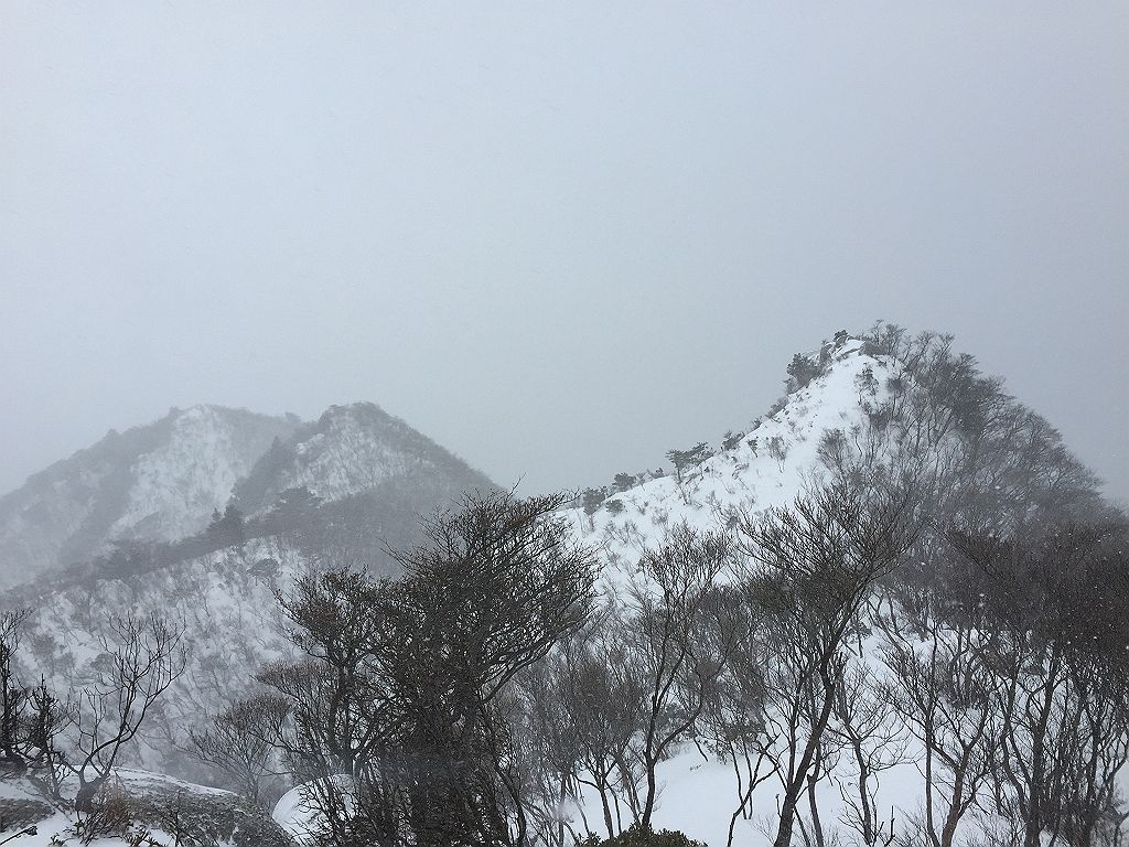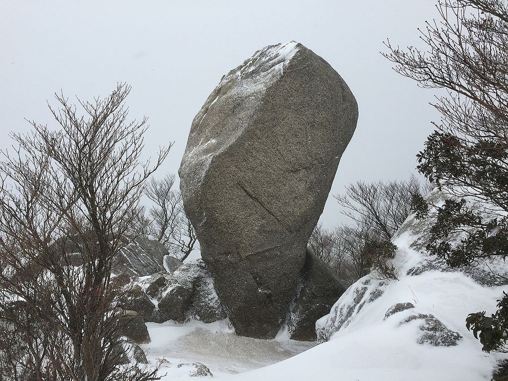 岩場のピーク。晴れていたらかなり展望はよさそうだけど吹雪で何も見えず