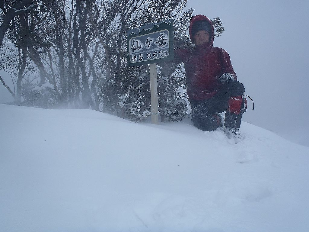 記念撮影。山頂はすごい吹雪きで目をあけるのもキツかった。この後さっさと撤退した
