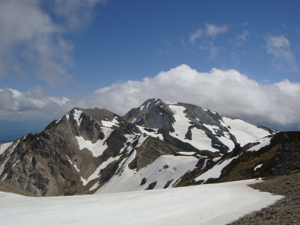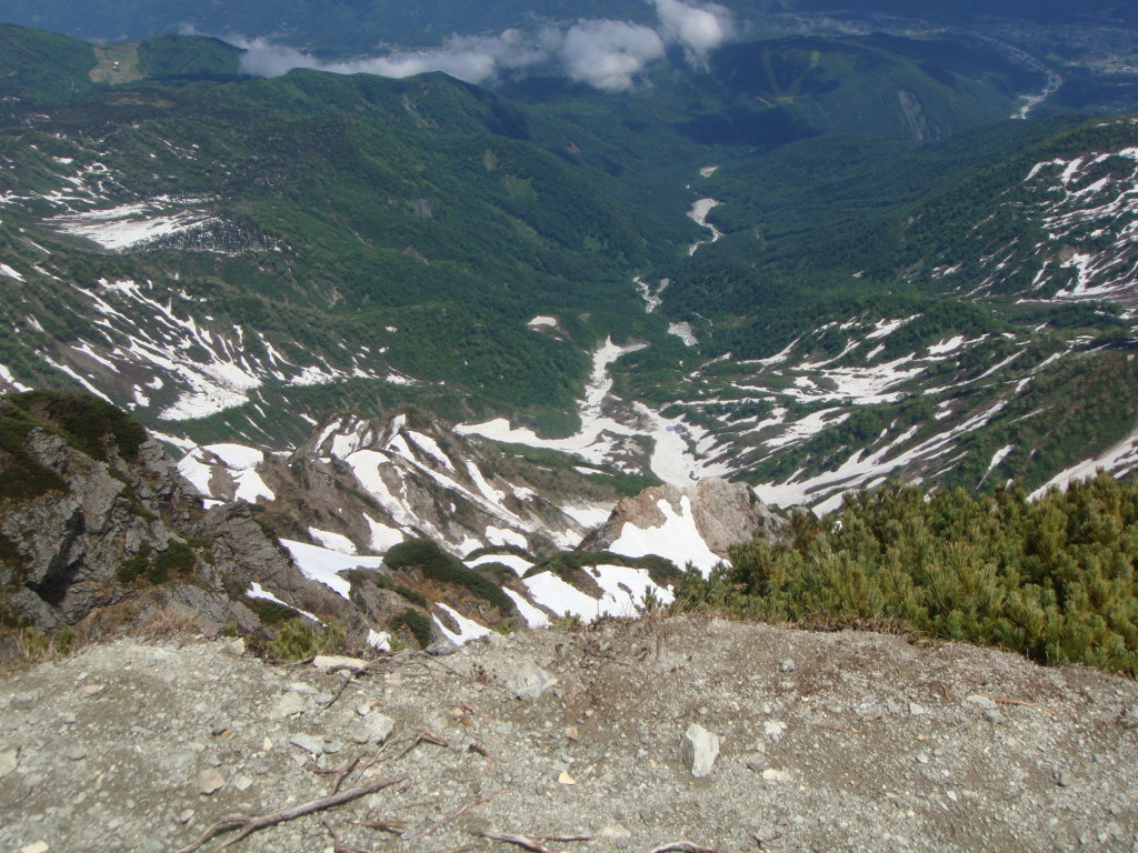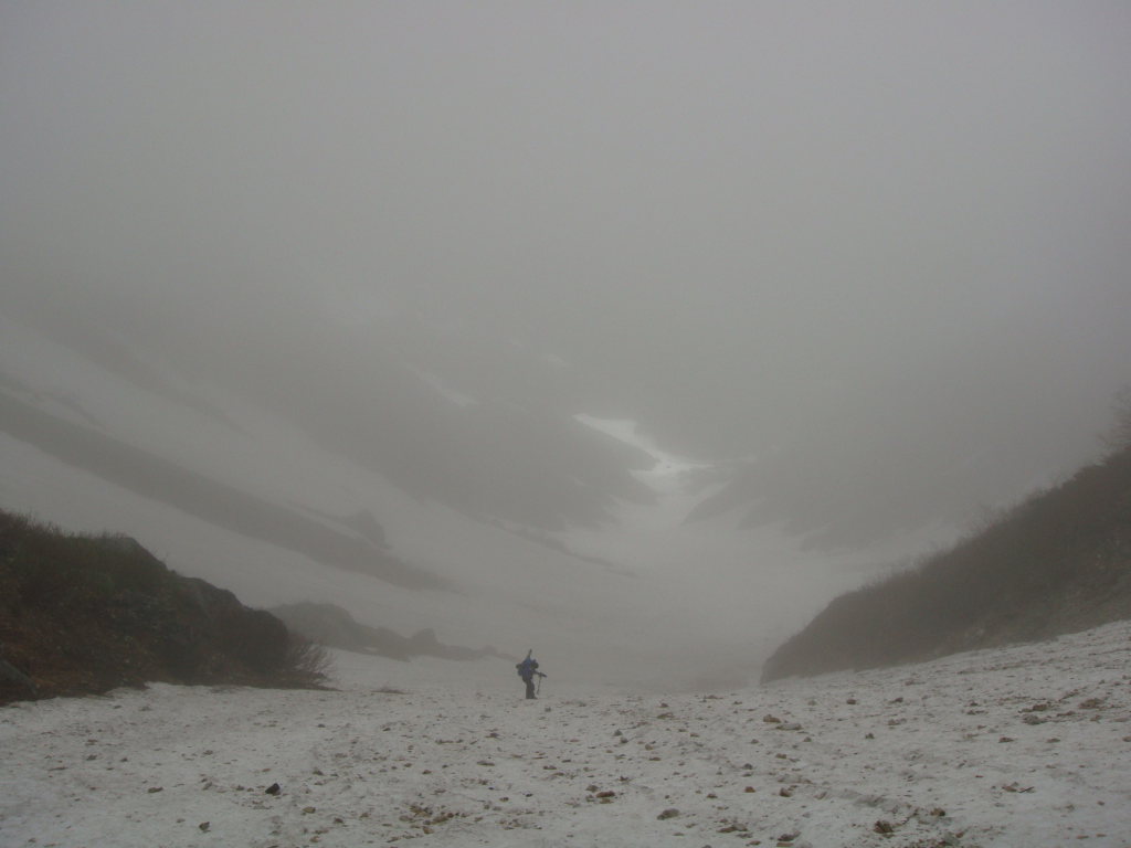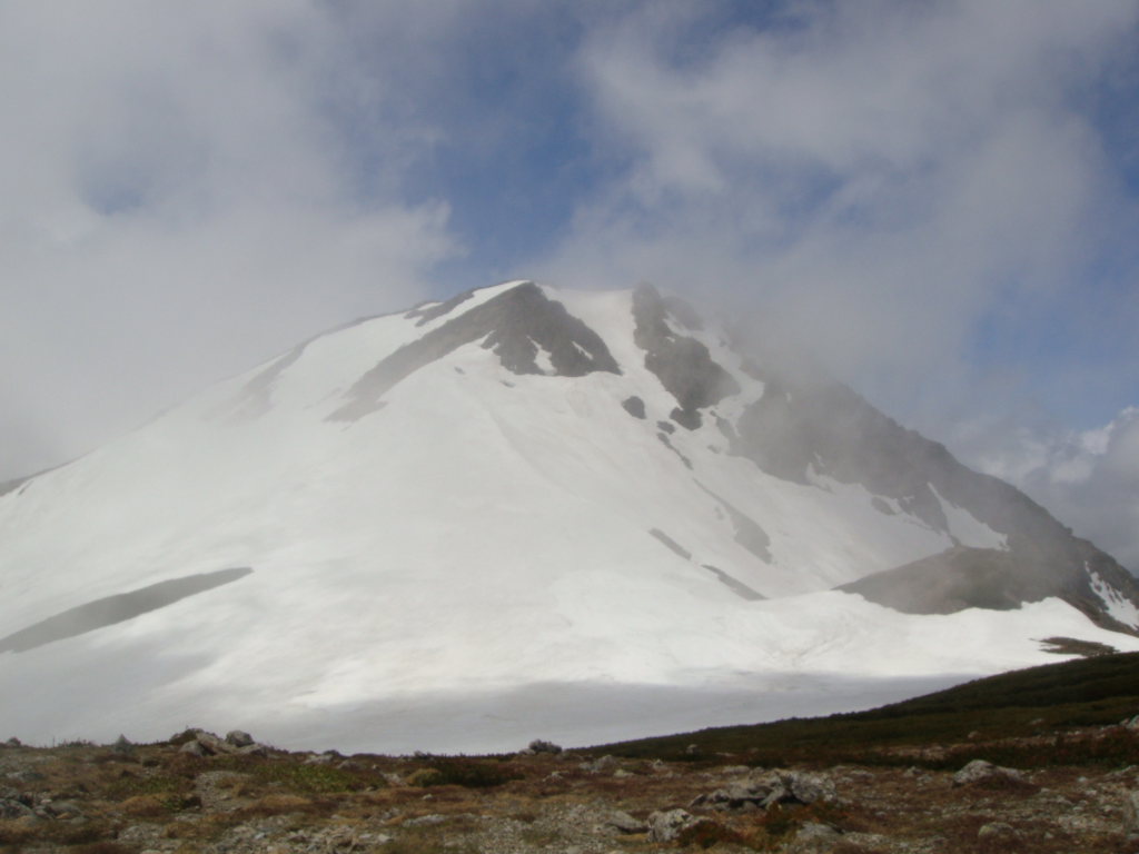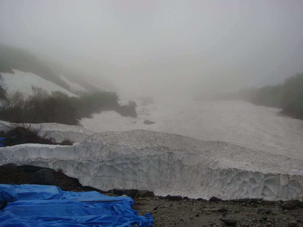 前日入りの予定でしたが白馬尻ではまだテント泊できないし、時間も中途半端だったので朝早くでて日帰りにしました。天気予報では9:00頃まで弱雨で午後から晴れでしたので雨上がりを狙っていったのですが、大雪渓を歩いて大雨で激寒かったです。周囲はガスっていて何も見えない雪道は精神的にこたえました。岩室の斜面がきつかったので左側の沢に入り右手の尾根を登って回避しましたが、これが見事にあの急斜面を楽して登ることができました。とはいえ、尾根のトップ付近で精神的にこたえていたのでもはや敗退と思いきや一回大きな休憩を取ろうということになりました。よく考えてみると休憩できるような場所が今までありませんでした。休憩後、雨が落ち着き時折ガスがはけてきました。でもまた大雨になったらもう敗退と心に決めてもう一度登ることに。今度は風が強くなり時折の突風。頂上宿舎まで標高差150m付近のところで、もはや下るのはヤバイと判断。宿舎で天候を見てこの日はもう一泊する勢いでした。頂上宿舎につくとストーブが設置されて暖かくまるで天国。それからそれまでの天気が嘘のように晴れました。快晴の中、ガスが湧きあがってきたりする幻想的な風景とアルプスの山々を望み山頂へ。その後、頂上宿舎に戻り暖をとるために600円のうどんを食べると超美味。そしていよいよ下山。一人登ってきた人に風の状態をきくと、かなりきつかったようで突風に煽られて滑落した人がいたとか。話しかけて「大丈夫です」といってたようです。様子をみながら下山しているとすっかり風も治まっていたのでスキー滑走開始。楽しい滑走を続けていると、ヘリがこっちに向かって近づいてきて、滑走してるのを怒られるのかと思いきや・・・急斜面の岩室上付近で血だらけになって倒れてる男の人が見えて、そこへホバリングしていました。命に別状はなさそうでしたが、遭難現場を初めてみました。聞いた話によると軽装だったとか!?気分を取り直して、いよいよ大雪渓を滑走。白馬尻見えてるけどスキーでもなかなか着かない長さでした。朝は雨と激寒、昼は展望バッチリ、下山時は遭難現場目撃と波乱万丈な一日でしたが、白馬の景色は良かったですが、標高差1703mの今までで一番キツイ日帰り登山とBCスキーになりました。