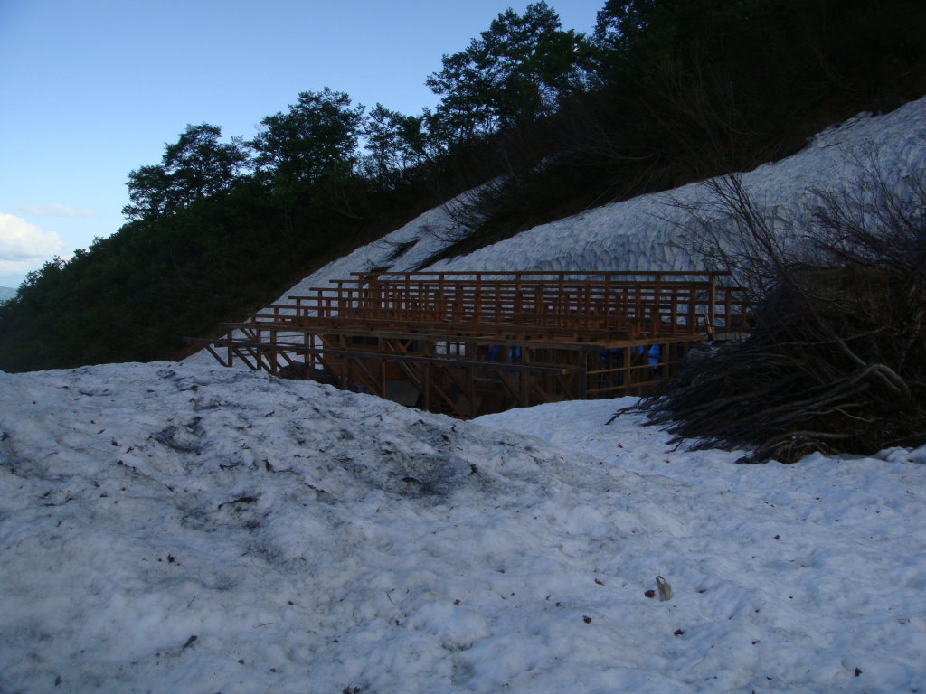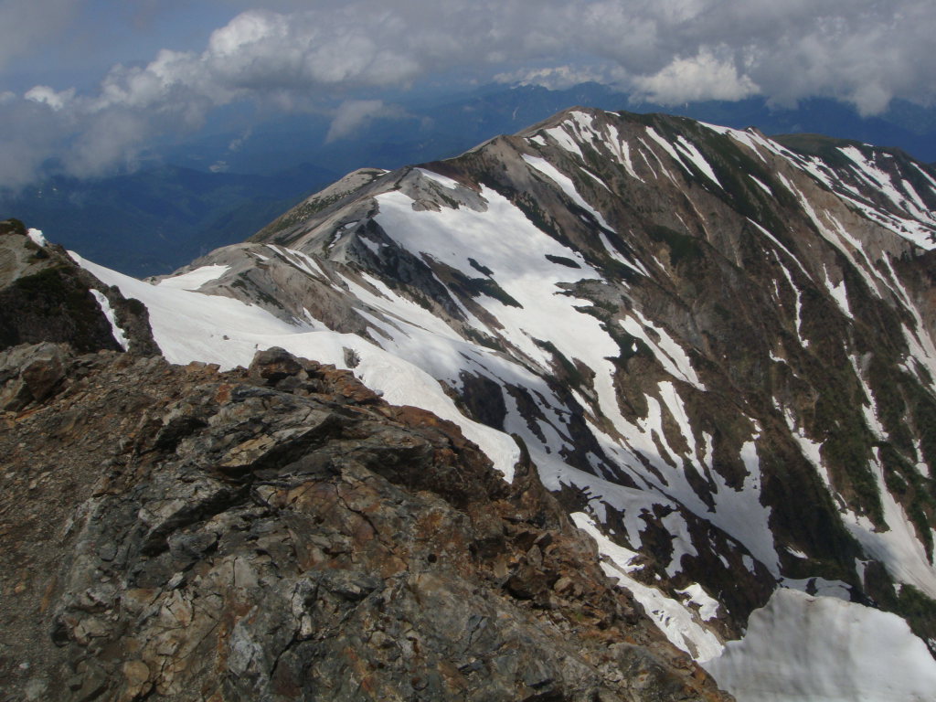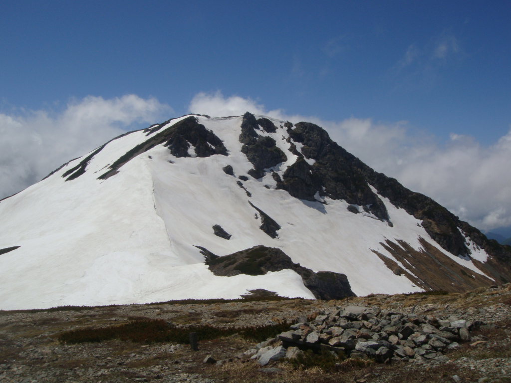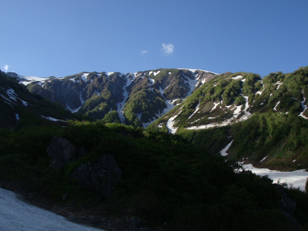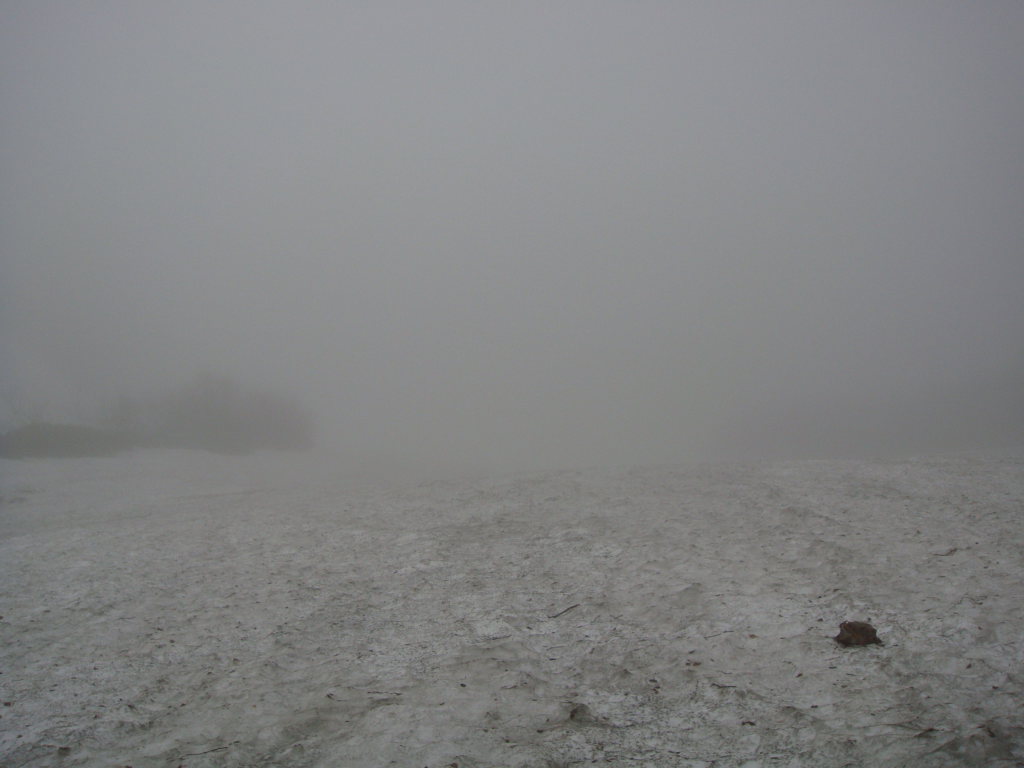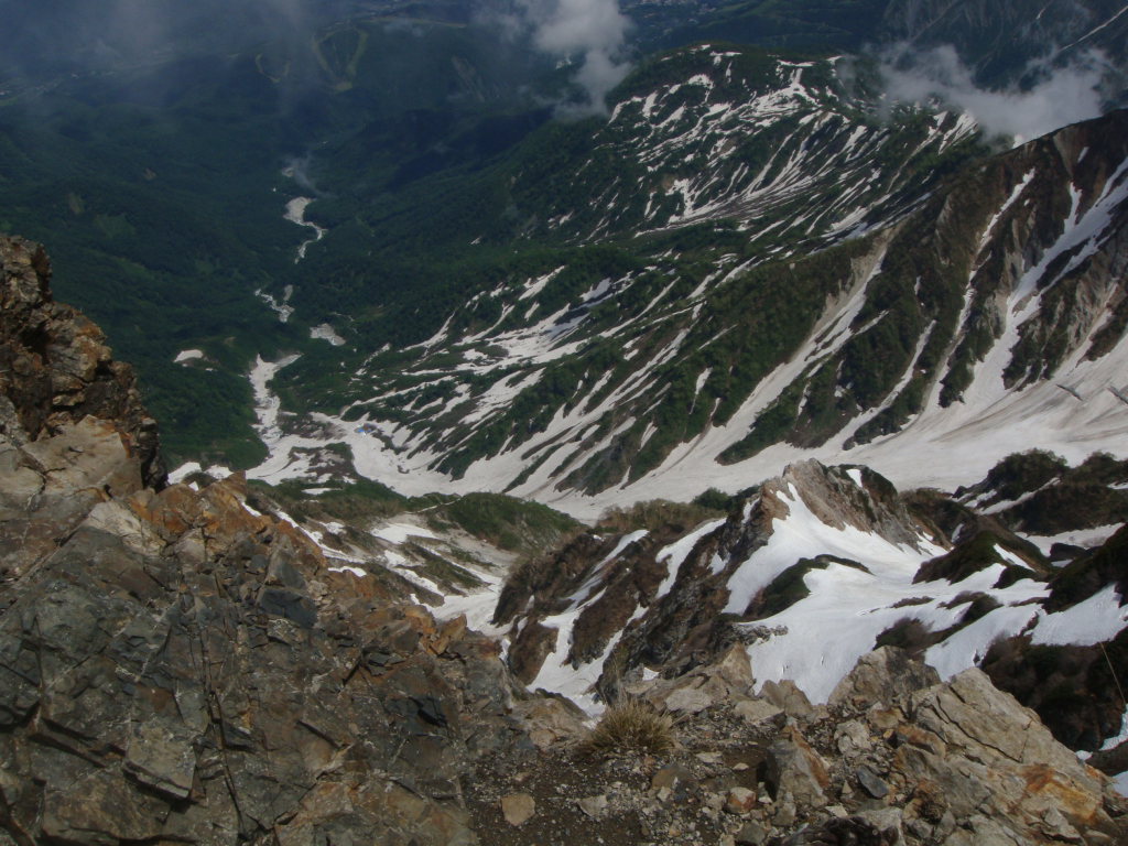 前日入りの予定でしたが白馬尻ではまだテント泊できないし、時間も中途半端だったので朝早くでて日帰りにしました。天気予報では9:00頃まで弱雨で午後から晴れでしたので雨上がりを狙っていったのですが、大雪渓を歩いて大雨で激寒かったです。周囲はガスっていて何も見えない雪道は精神的にこたえました。岩室の斜面がきつかったので左側の沢に入り右手の尾根を登って回避しましたが、これが見事にあの急斜面を楽して登ることができました。とはいえ、尾根のトップ付近で精神的にこたえていたのでもはや敗退と思いきや一回大きな休憩を取ろうということになりました。よく考えてみると休憩できるような場所が今までありませんでした。休憩後、雨が落ち着き時折ガスがはけてきました。でもまた大雨になったらもう敗退と心に決めてもう一度登ることに。今度は風が強くなり時折の突風。頂上宿舎まで標高差150m付近のところで、もはや下るのはヤバイと判断。宿舎で天候を見てこの日はもう一泊する勢いでした。頂上宿舎につくとストーブが設置されて暖かくまるで天国。それからそれまでの天気が嘘のように晴れました。快晴の中、ガスが湧きあがってきたりする幻想的な風景とアルプスの山々を望み山頂へ。その後、頂上宿舎に戻り暖をとるために600円のうどんを食べると超美味。そしていよいよ下山。一人登ってきた人に風の状態をきくと、かなりきつかったようで突風に煽られて滑落した人がいたとか。話しかけて「大丈夫です」といってたようです。様子をみながら下山しているとすっかり風も治まっていたのでスキー滑走開始。楽しい滑走を続けていると、ヘリがこっちに向かって近づいてきて、滑走してるのを怒られるのかと思いきや・・・急斜面の岩室上付近で血だらけになって倒れてる男の人が見えて、そこへホバリングしていました。命に別状はなさそうでしたが、遭難現場を初めてみました。聞いた話によると軽装だったとか!?気分を取り直して、いよいよ大雪渓を滑走。白馬尻見えてるけどスキーでもなかなか着かない長さでした。朝は雨と激寒、昼は展望バッチリ、下山時は遭難現場目撃と波乱万丈な一日でしたが、白馬の景色は良かったですが、標高差1703mの今までで一番キツイ日帰り登山とBCスキーになりました。