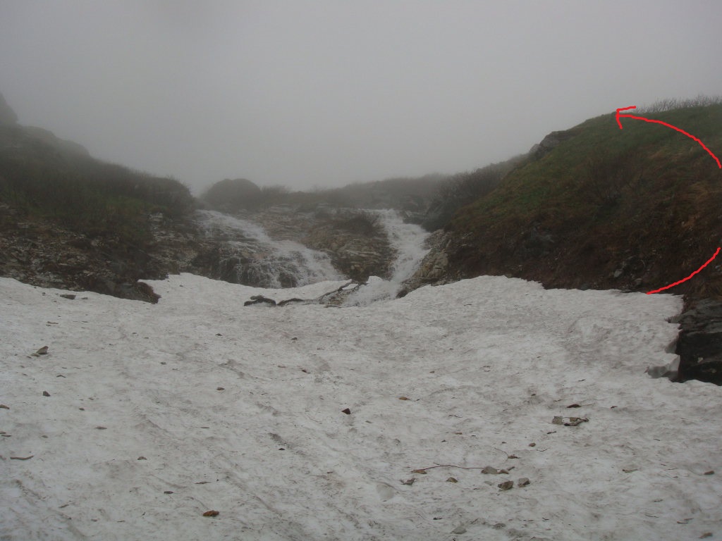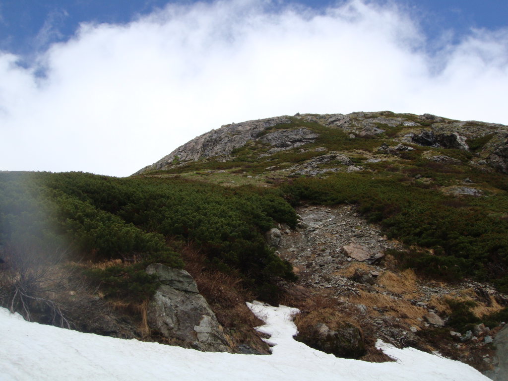エスケープした尾根のトップ付近。頂上宿舎は右だが、急斜面なので左に登ってからトラバースする