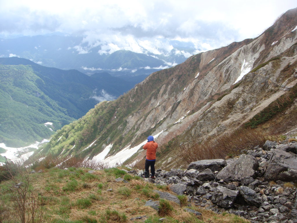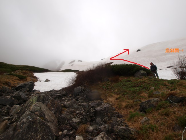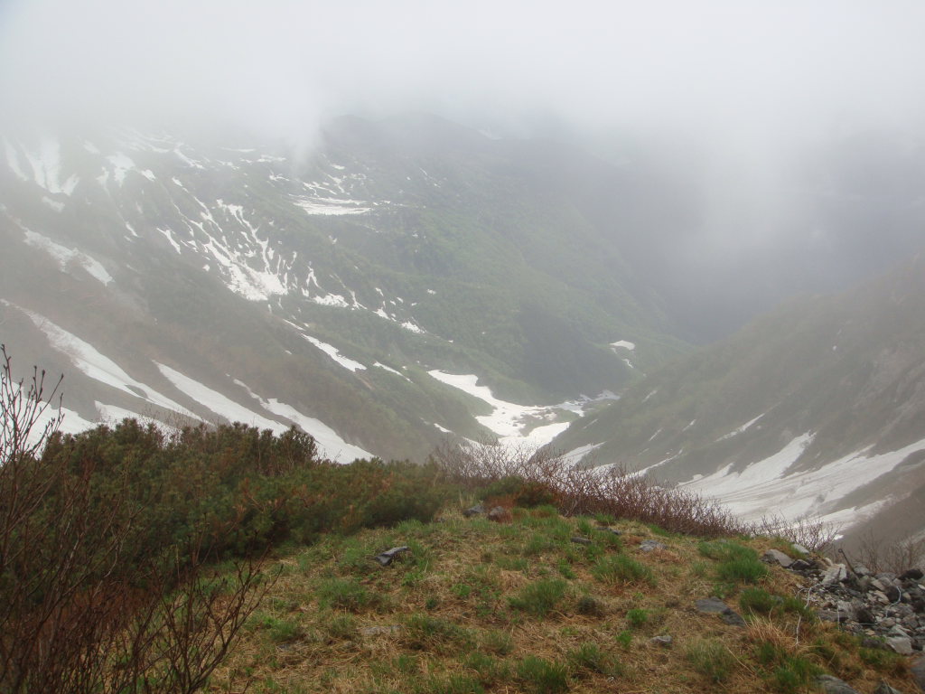 岩室の急斜面トップ付近に出て振り返るとガスがはけたときに大雪渓が見えた。休憩する場所がなかったのでここで大きく休憩