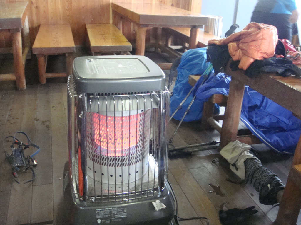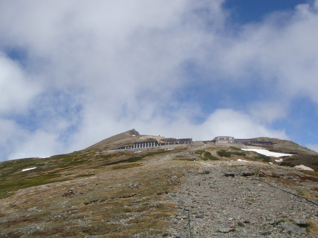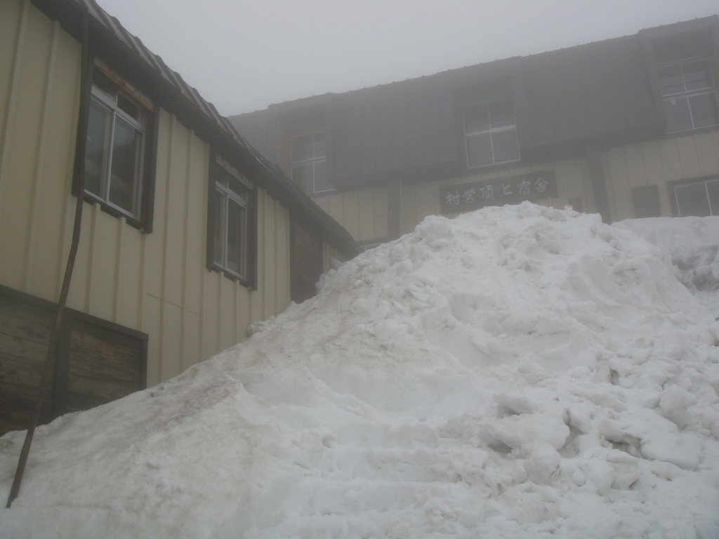 村営頂上宿舎に到着。またガスった。ここで風が治まらなければ一夜過ごすことも考えた