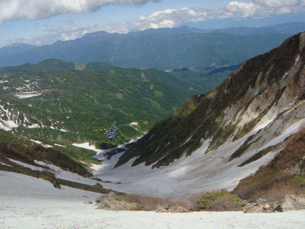 岩室の急斜面で滑落した人がいると聞いていたが、ちょうど岩室上部に倒れた人が見え、救助ヘリが来ていた