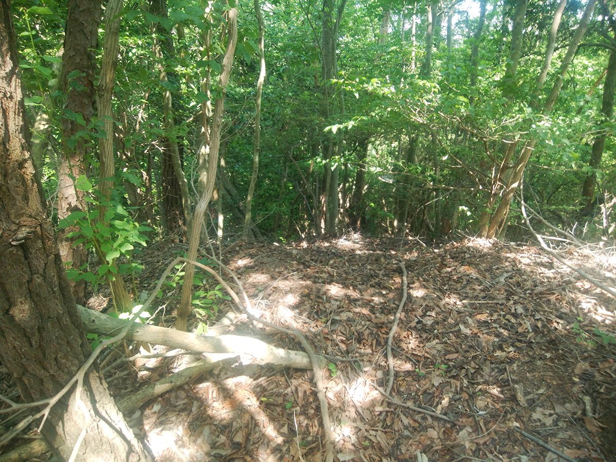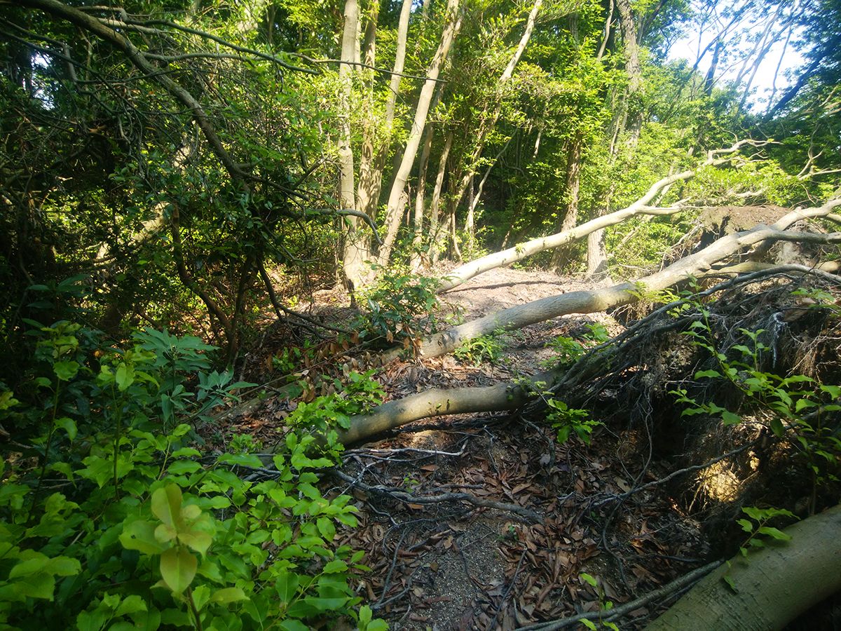 ここで少し迷ったところ。国土地理院地図の破線だとこの樹林帯の中を進まないといけないけど、こんなところ下れないのでテープ頼りに下ってみることにした