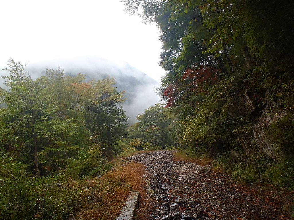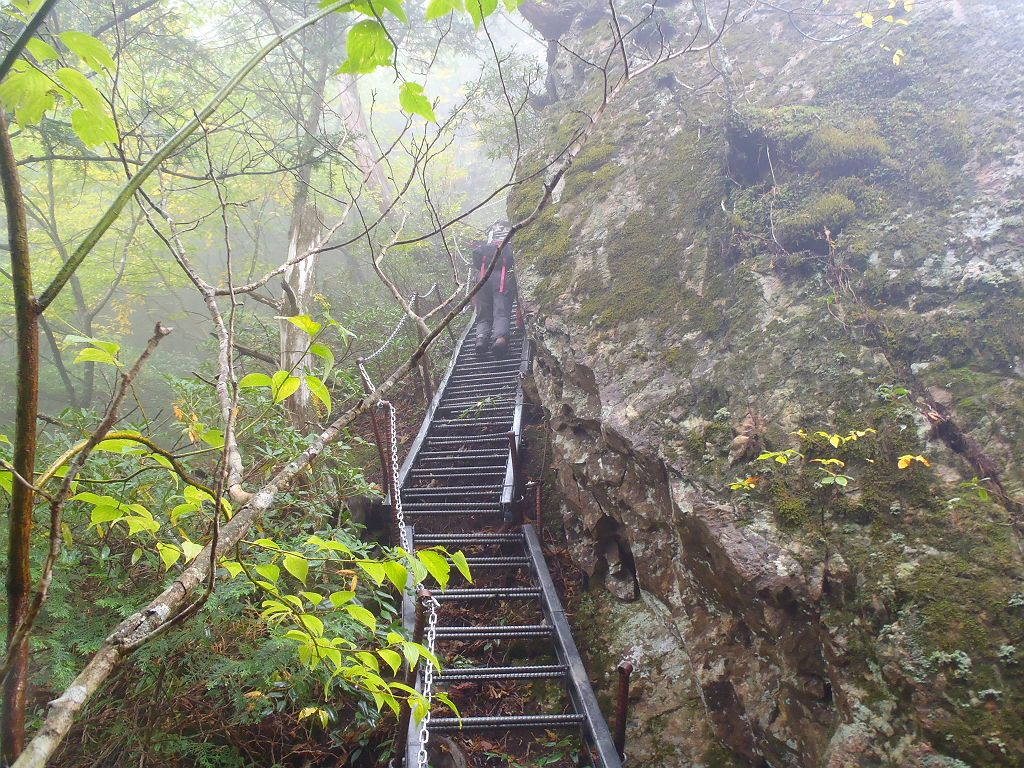 関西屈指の難コースといわれた双門・弥山コースは今年で二回目。今回はザンキ平の肩より弥山へ直登するコースをとりました。あらかじめ最短で下れる行者還トンネル西口に自転車を置いてのスタート。スタート時間は8時とちょい遅めでした。今回の予想外だったのは雨がこれほど降ったことでしょうか。朝は雨があがりそうな勢いだったのが、逆に悪くなりました。そのため沢渡りや雨の滑りやすい岩登りで大幅に時間がかかってしまった。ザンキ平の肩よりとりあえず暗くなる前に弥山へ登ろうということに・・・。直登はトレースはなし。ピンクテープが貼られていたのでそれに頼りに登っていけば良いが、とにかく上を目指せばいいです。ただし、ピンクテープのあるところのほうが歩きやすい道でした。ザンキ平の肩より1時間ほどで迷ヶ岳(1695m)に到着。ガスで展望は見えませんでしたが、人があまり踏み込んでいない苔の原生林とガスった風景といった素晴らしい風景が待っていました。この付近は植物が非常に柔らかくふわふわした感じでした。迷ヶ岳から弥山までは稜線をたどればそこまで迷うようなことはないでしょう。修復山(1846m)を経て弥山手前の大倒木地帯です。弥山が目の前なはずなのに、だだっ広い地帯でかなり迷いやすいです。しかも倒木が邪魔でどう歩いていけばよいのかも考えないといけませんでした。結局、弥山に到着したときは暗くなっていました。その後、一泊するかどうか考えましたが、2時間ほど休憩して、体力も回復、ナイトハイクになれた面子だったので行者還トンネル西口へ下ることにしました。今回は次の日の予定もあり、このように暗いときに下りましたが、一泊二日することをおススメします。