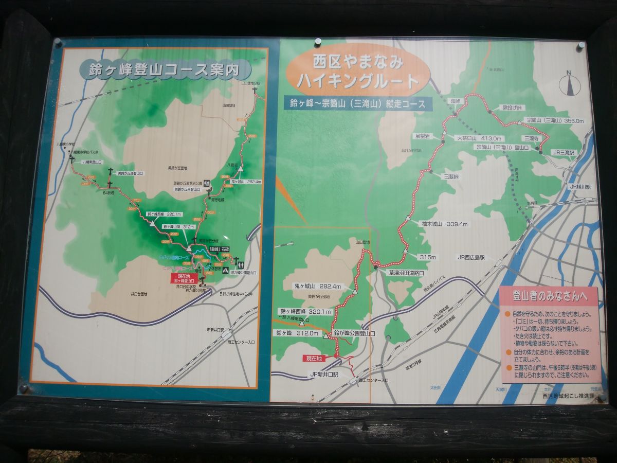 登山口には鈴ヶ峰登山コース案内板がある。いろんなコースがあるみたいだけど、ここが最短ルートっぽい