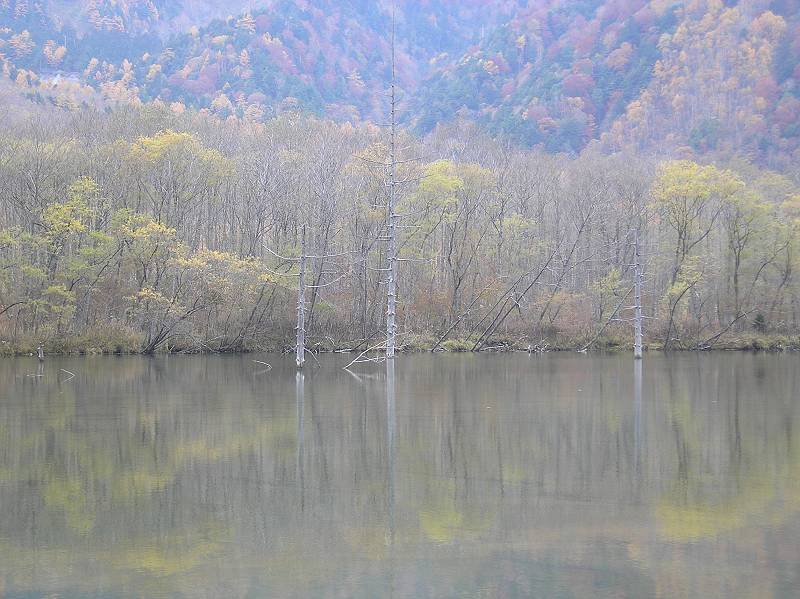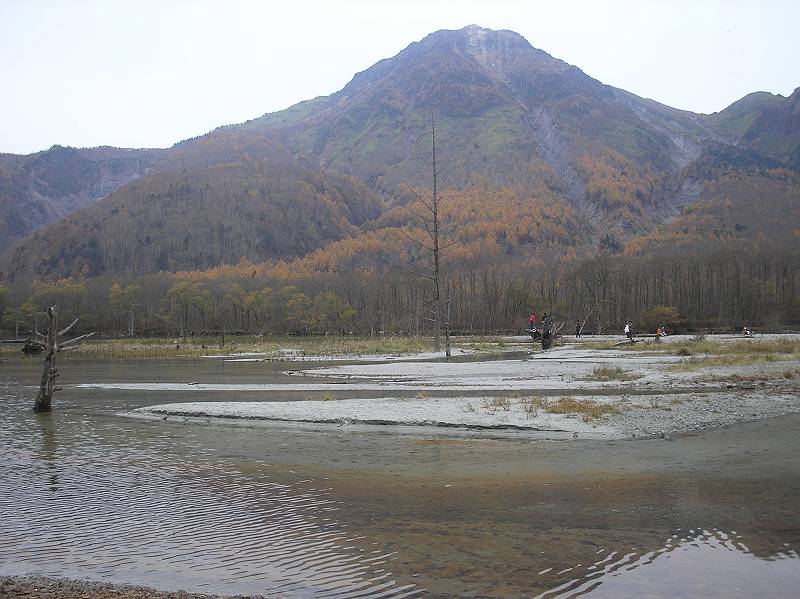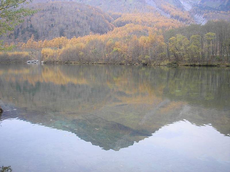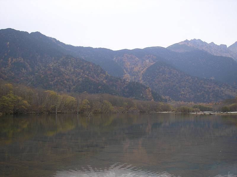大正池にうつる焼岳。天気はまずまずだけど水面にちゃんとうつっていた
