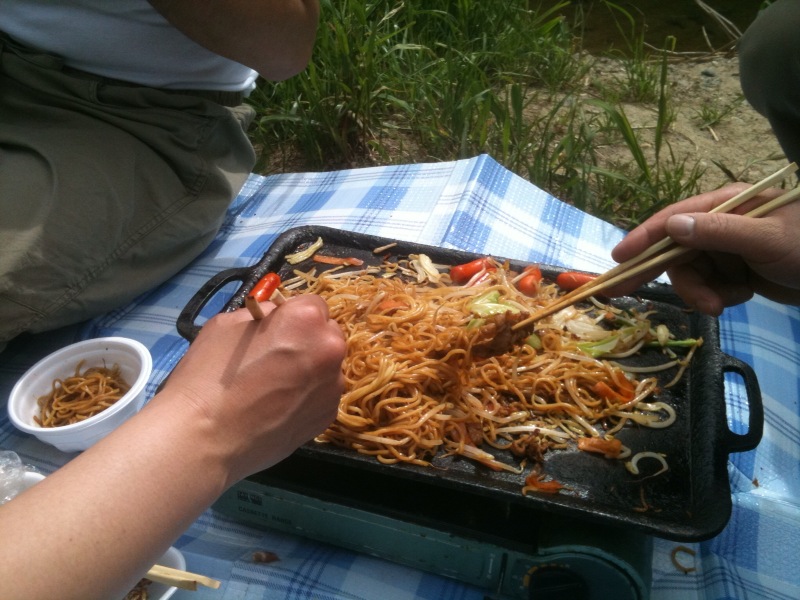 • 河原に下りれる場所があったのでそこで焼きそばを作ってみんなで食べた。この鉄板を持ってくるのが大変だった