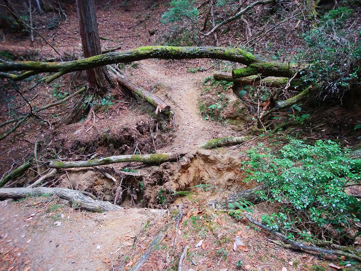崩壊箇所。写真ではわかりにくいけどジャンプはできない幅。なんとか無理矢理行ったけど巻いたほうがよかった