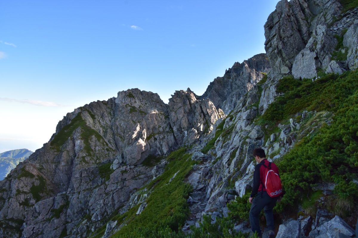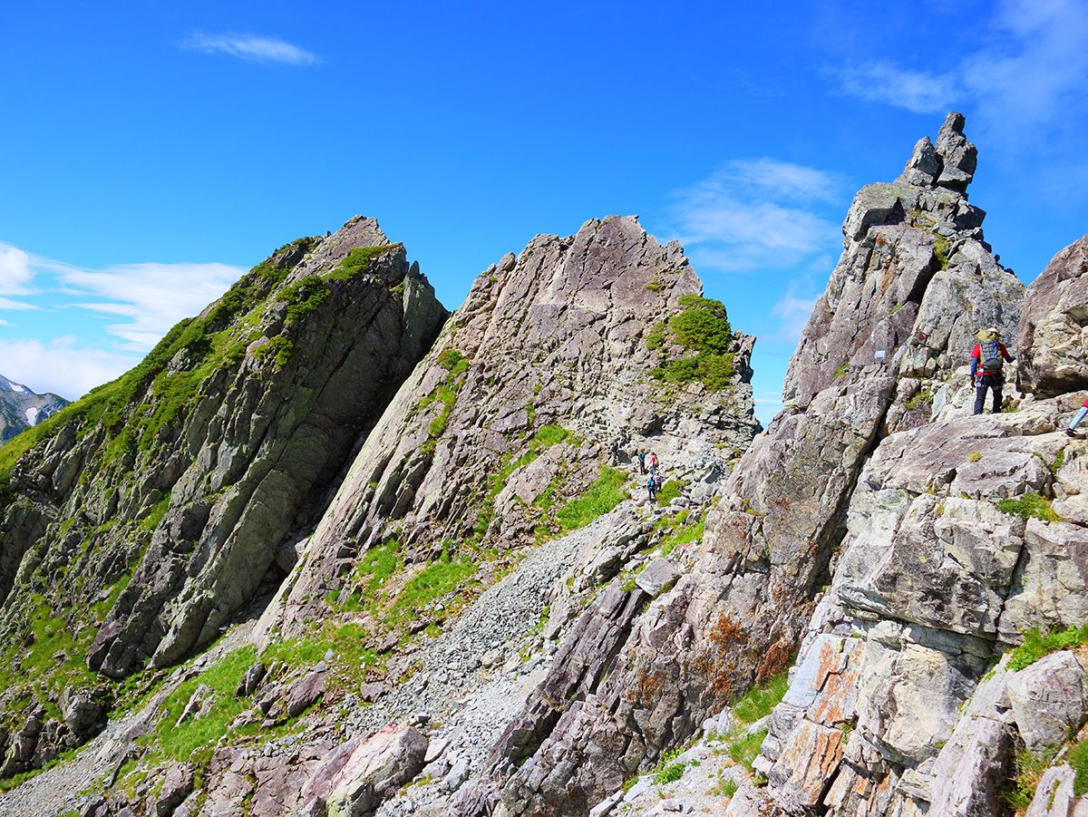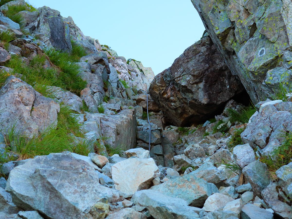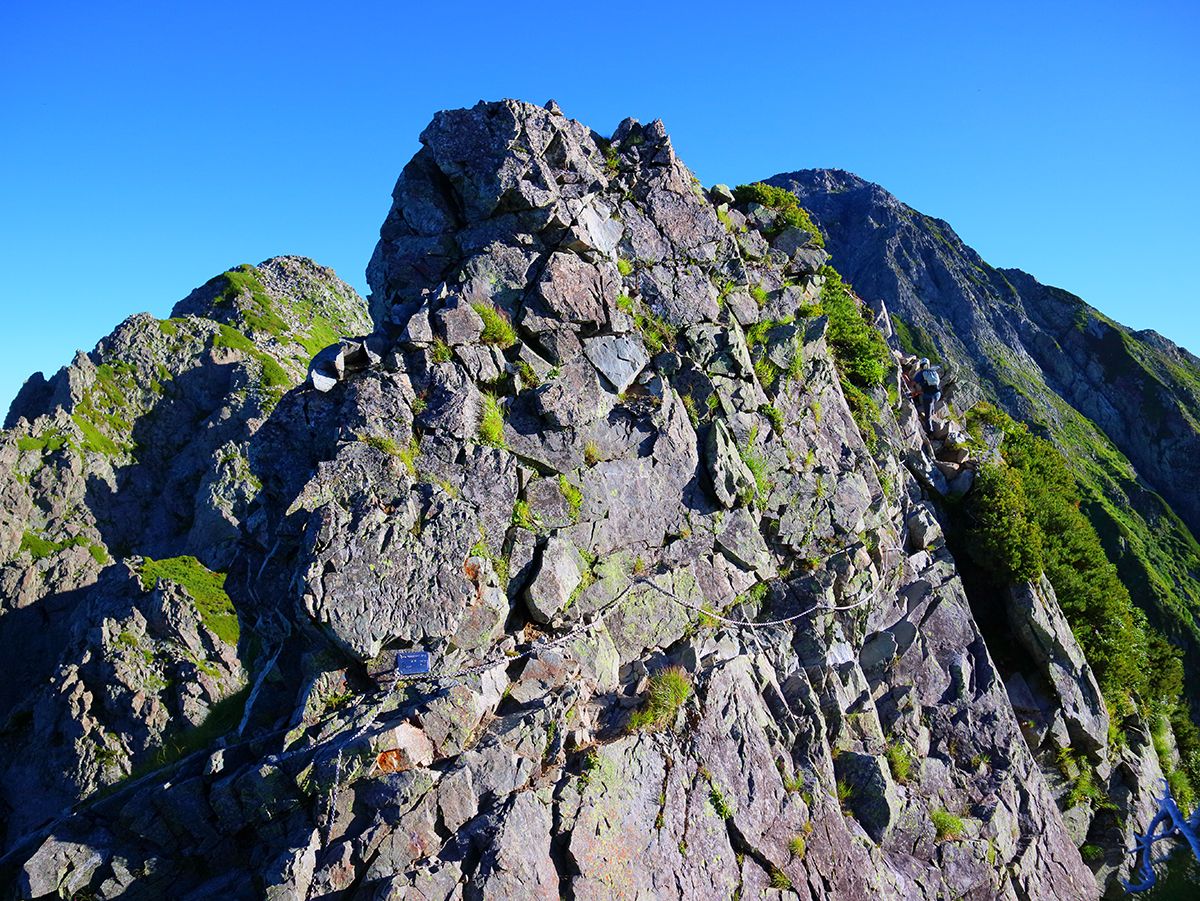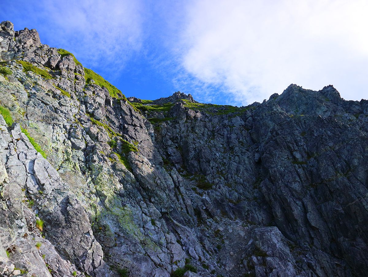 迫力ある岩場と青空。山頂に着くまでガスらないでほしいと祈るだけ。ここからあともうひと頑張り!