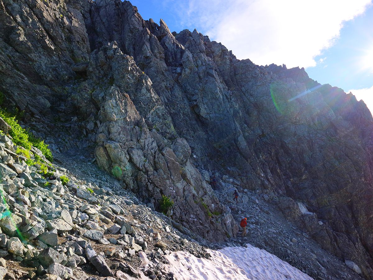 ここで雪渓の上をトラバースして本格的な岩場の登りがはじまる
