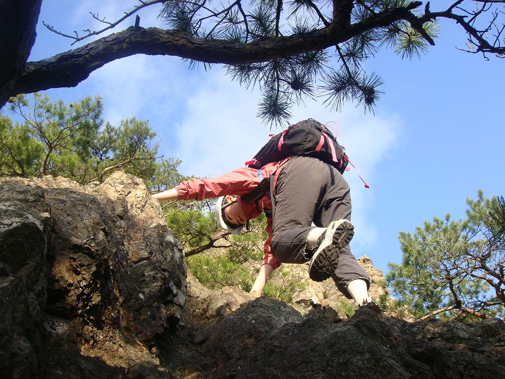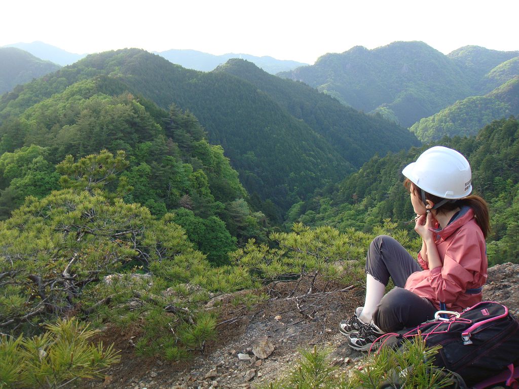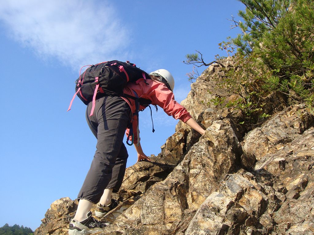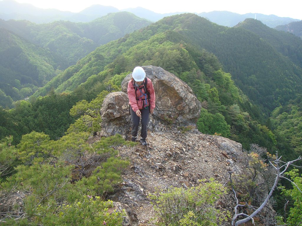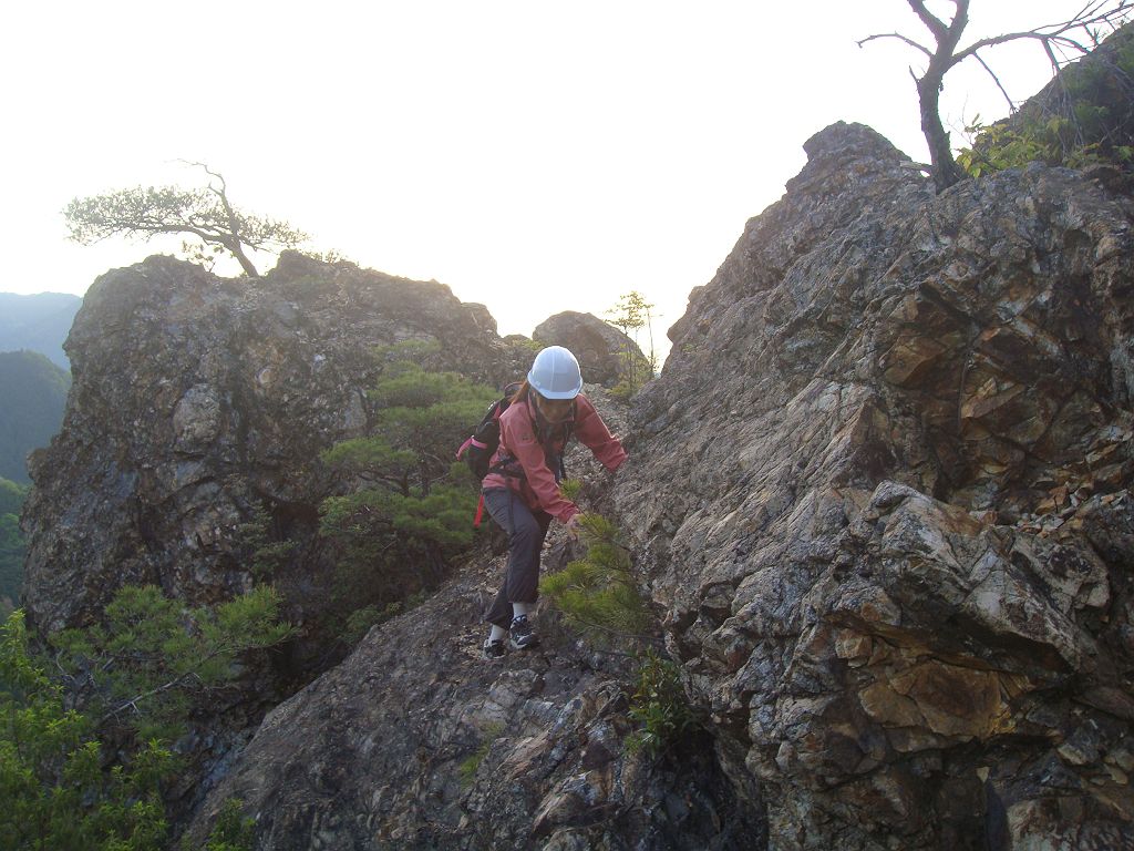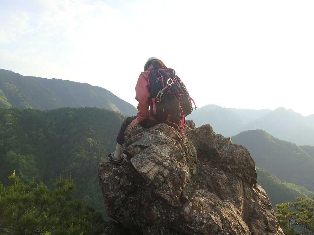 岩の穂先で座るS嬢。こういうのは怖くないらしい