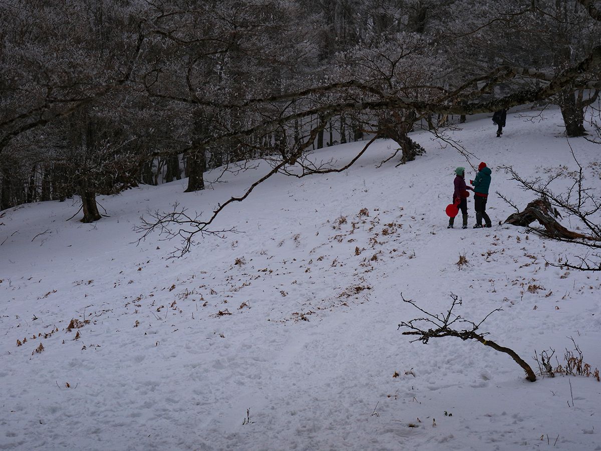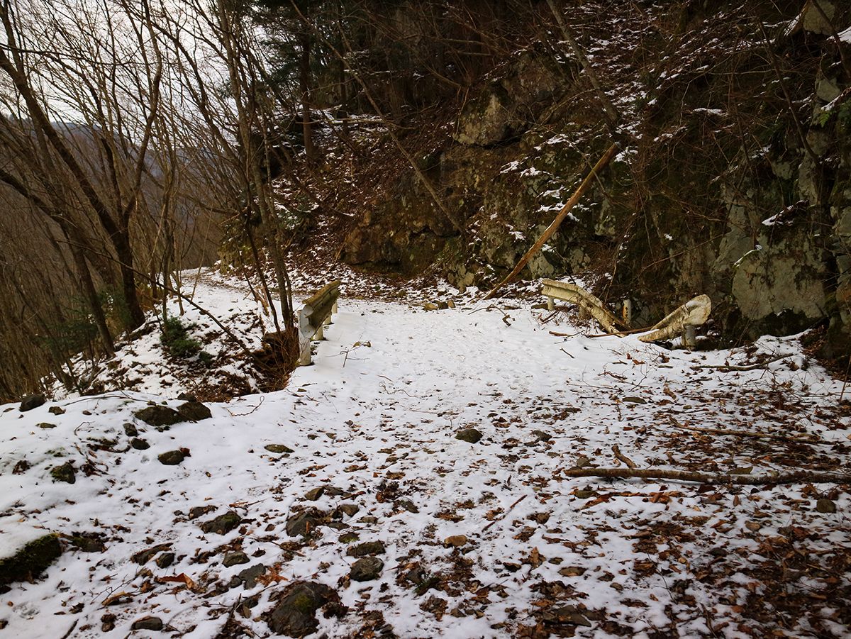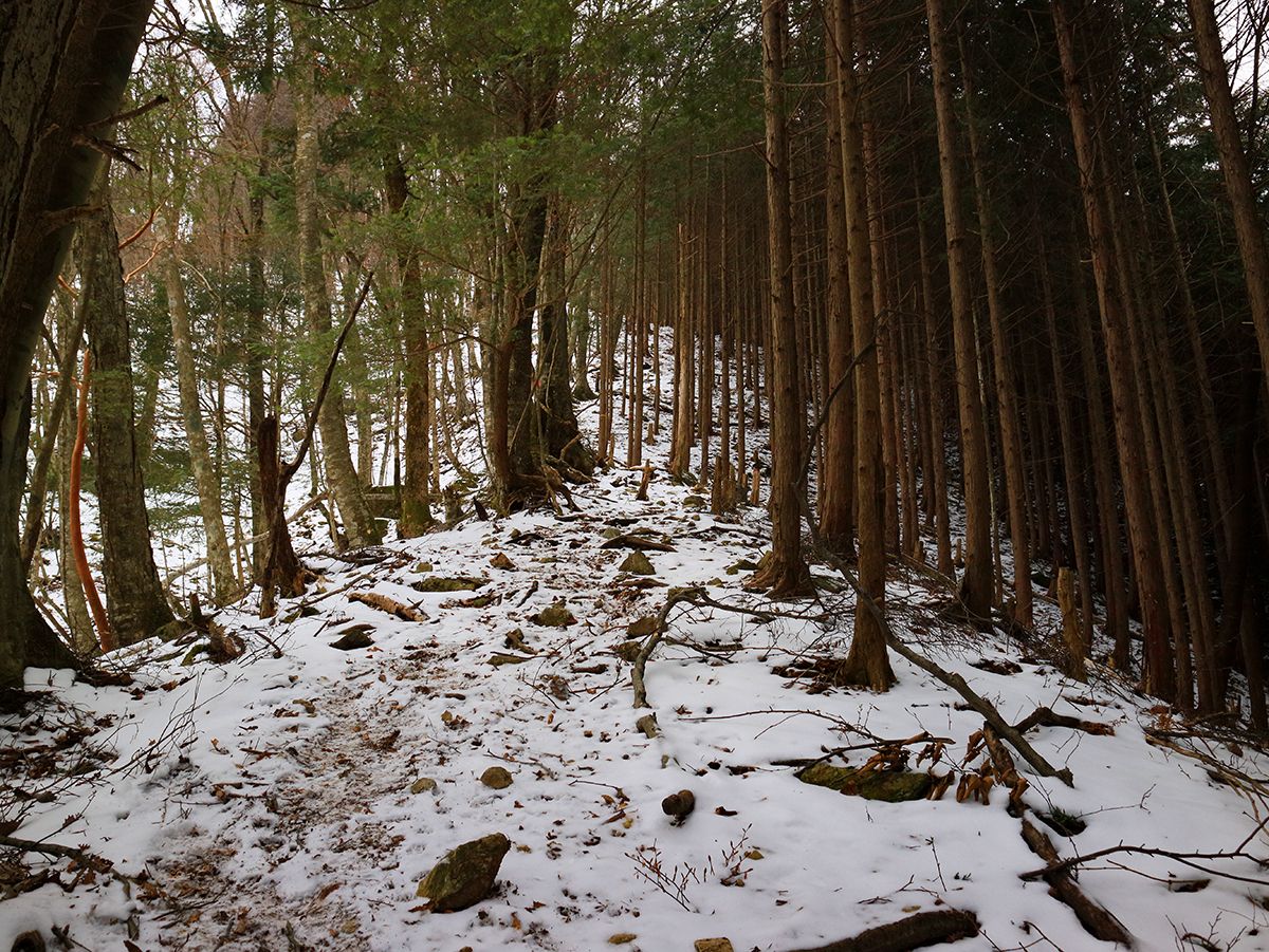 雪が少ないとはいえ、かなり滑るので下山はアイゼンを装着して下ることにした