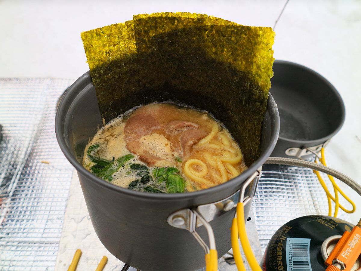 本日の昼食は通販で買った横浜家系ラーメンの作田家を作る。山で食べる家系ラーメンはどうだろうか!?