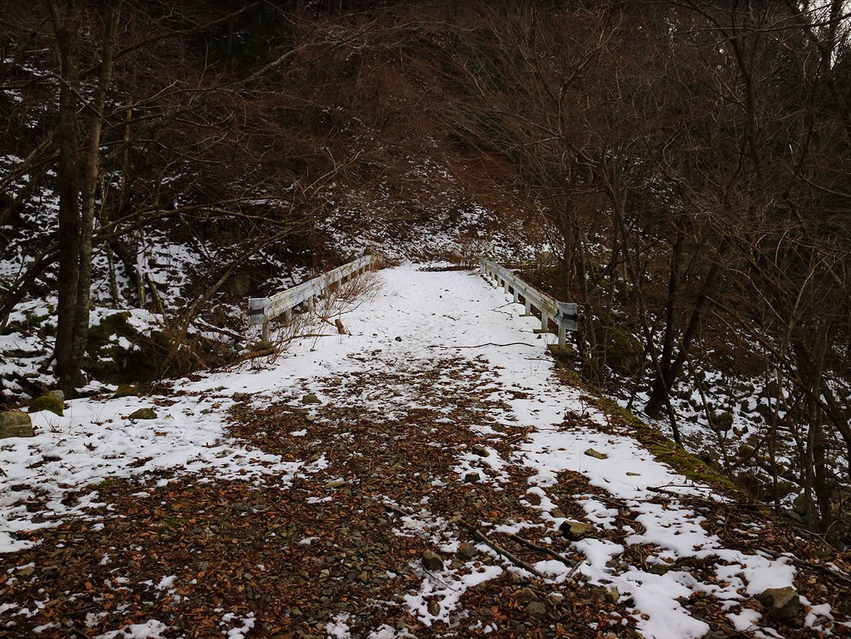 金引橋まで下りてきた。橋を渡ってアイゼンを外して長い林道を歩いていくことになる