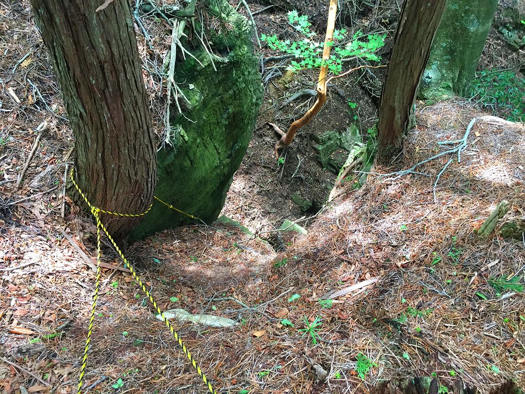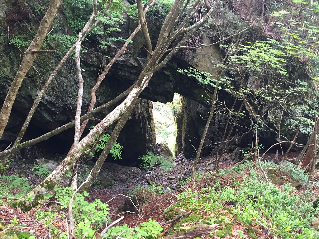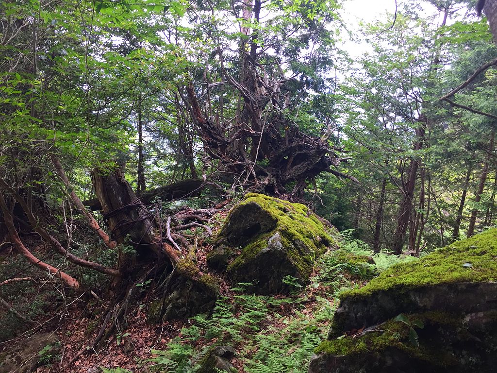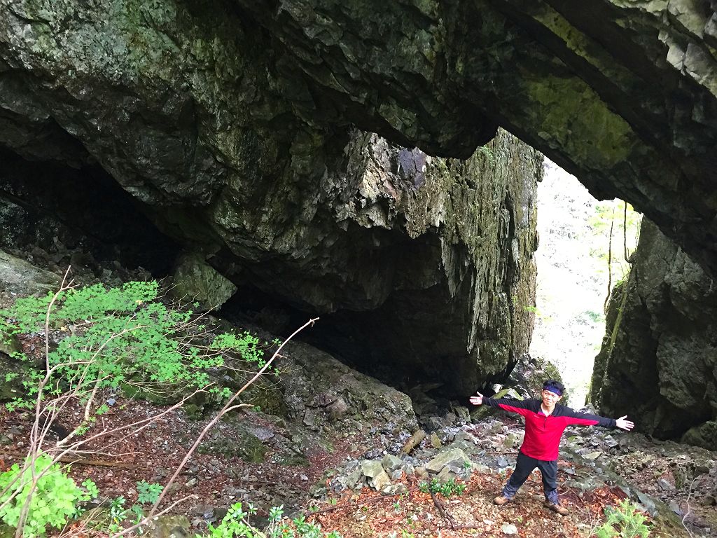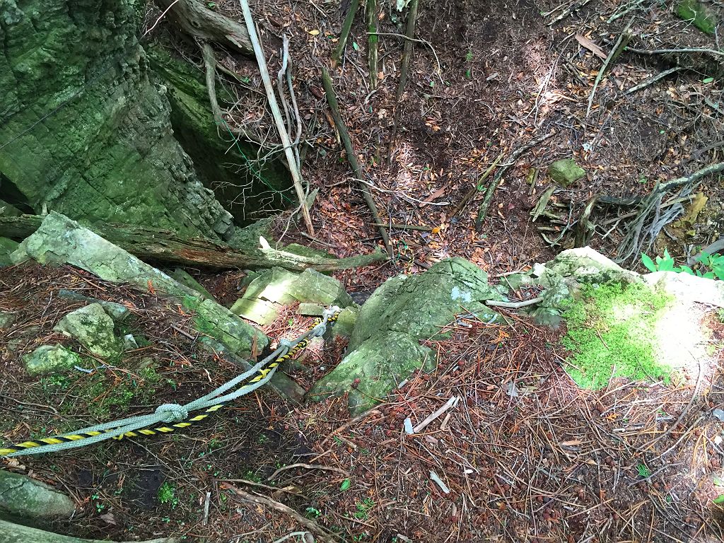 今回のメインはここです!場所がはっきりしなかった石の双門ですが、登山好人さんがポイントをつかんでいたのでそのポイントへ向かいました。トラバースポイントから標高100mほど下ってワイヤー地帯と倒れ木のところを右へ下って、ようやくありました。こんなところどうやって見つけたんでしょうか。でも、ものすごい迫力ある岩でした。そのまま双門ルートへ戻ろうと倒れ木のところからワイヤー地帯を経てずっとトラーバスする感じで双門ルートの出会いまでテープが巻いてありました。双門ルートの出会いはちゃんとした分岐になっていましたが、ちょっと見落としやすい場所でした。