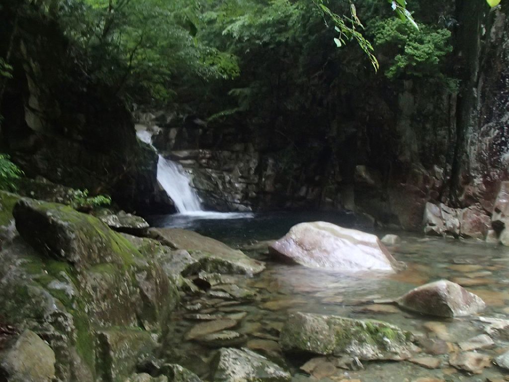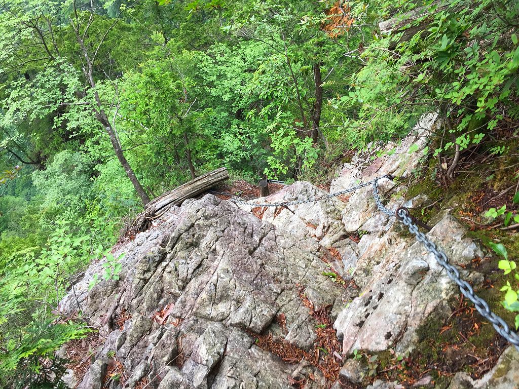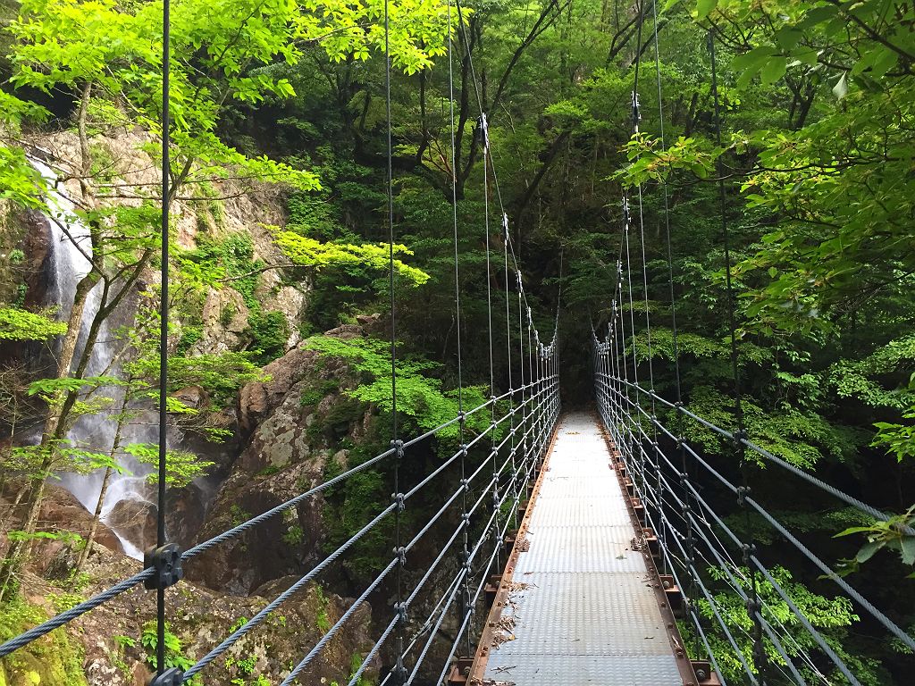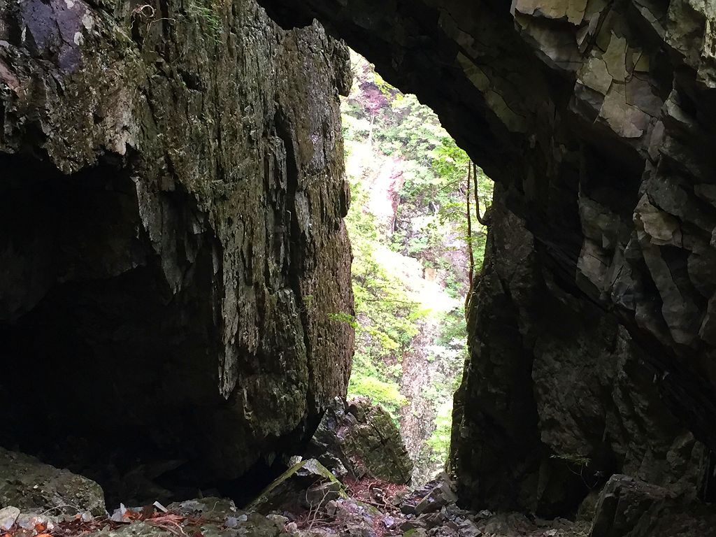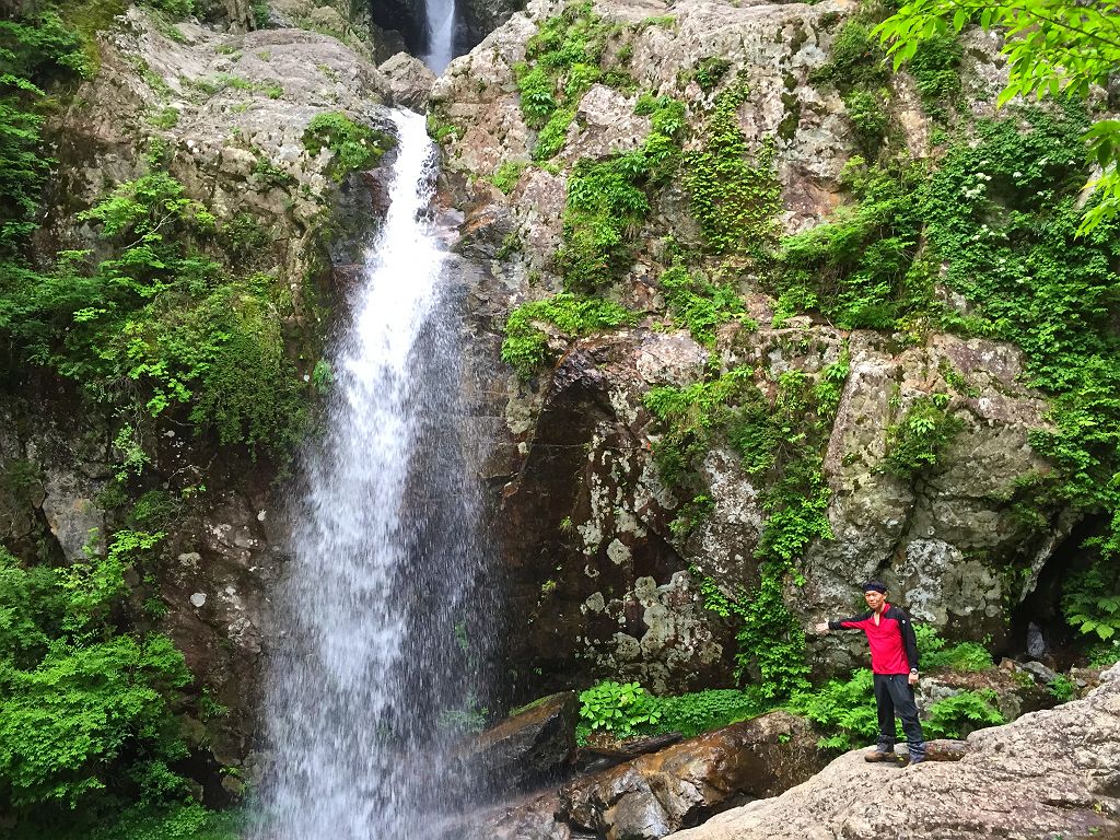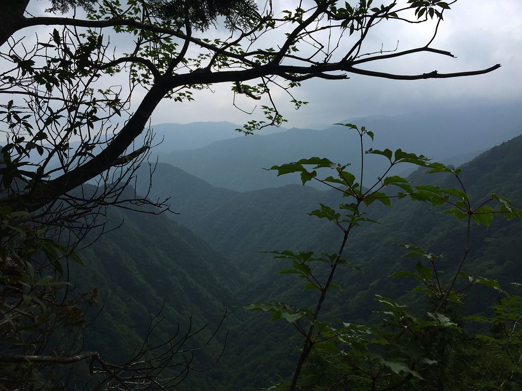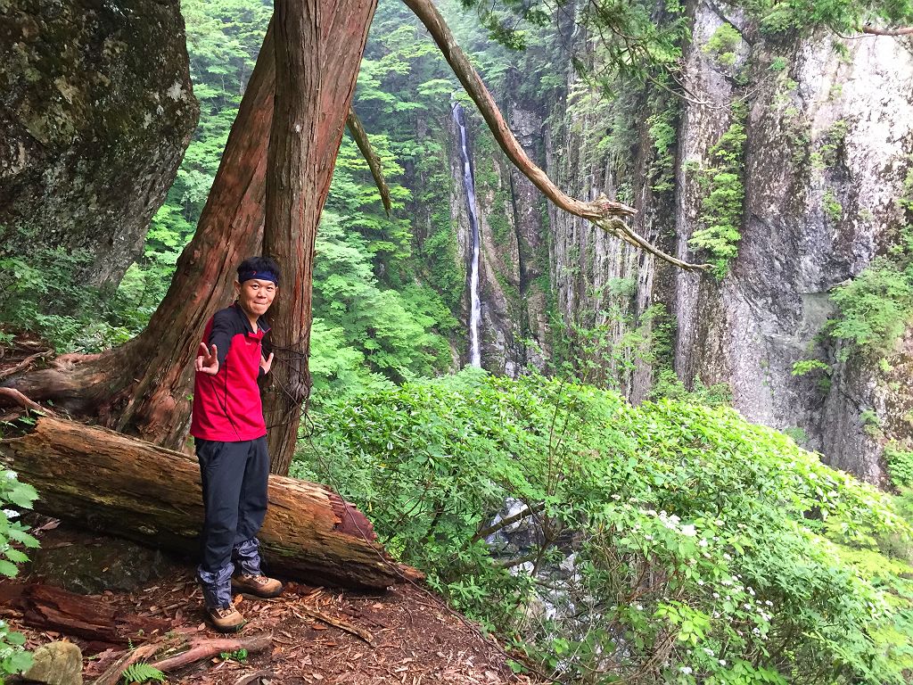 双門ルート出会いで14:30近くになっており、もやは時間が押していたのと、迷ヶ岳からの下りは知らないルートなので、双門ルートを下ることになりました。双門ルートでも一番やばそうなルートを下るわけですが、下りとなると快適です。20分くらいで双門のテラスに到着。まさかまたここに来るとは思いもしませんでした。そこから一の滝までの下りが長い!!!ちょいルートがわからなくなったりしながら、なんとか吊り橋へ到着して大休憩。そこから沢まで降りたところ財布を拾う。財布は先ほどご本人さんのところへ送りました。その後ゲリラ豪雨に・・・岩陰に隠れながら雨宿りしましたが、一向に止む気配なしだったのでカッパ着て出動。もうパンツの中までびしょびしょなので沢の渡渉はガツガツ渡る。ただ、全身ドボンだけは注意しながら歩きました。沢に降りてからの雨でよかったですが、そこからのはしごやら鎖場やら、雨の双門ルートの下りはツルツル滑り易い超デンジャーコースでした。巻き道をコースアウトしてダムまでいってしまいましたが、確か最初のガマ滝からの巻きルートだという記憶があったのでもう少しだ!っと思いながら進んでガマ滝到着。そこから白川八丁を経て、やっと林道までの登りにさしへかかります。いつも下りばっかで使っていましたが、この林道まで結構うざい登りでした。