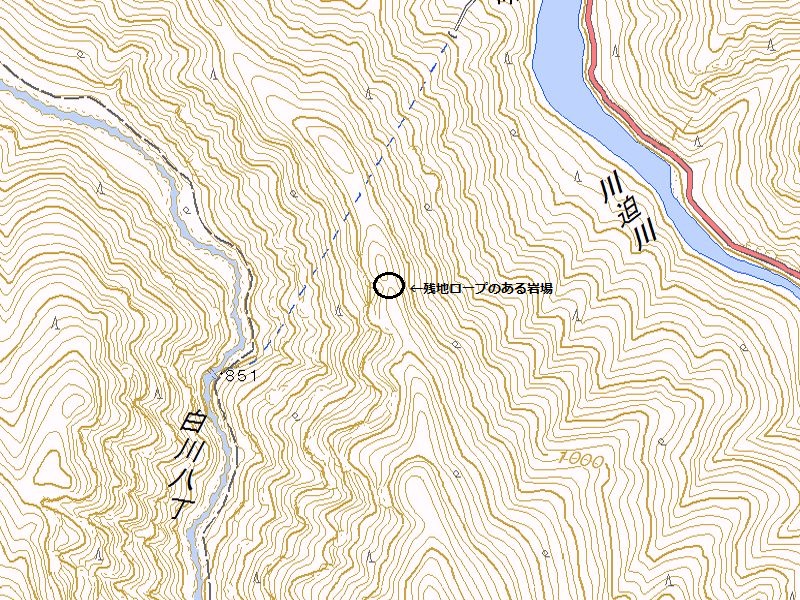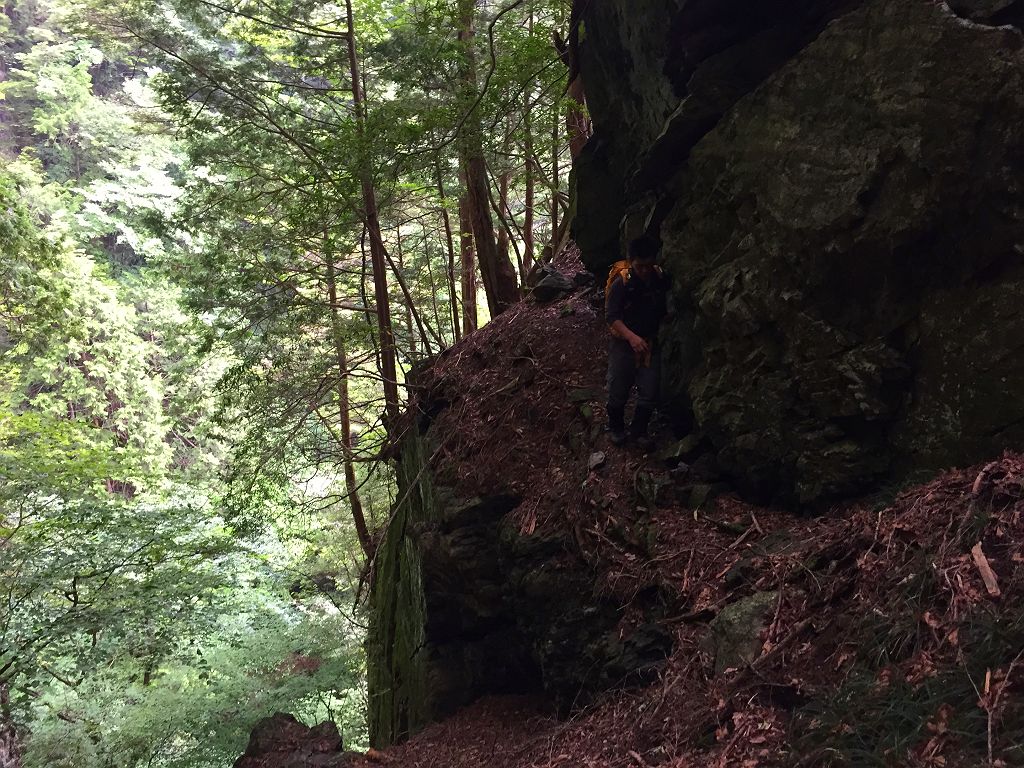 トサカ尾根につくとすぐに前回行きそびれたトサカ尾山へ向かいました。この登りがまたキツイ!!トサカ尾山には三角点と山頂札だけあって何もありませんでした。そこから長ぁ~~~いトサカ尾根が続きます。地図で見る限りは楽そうなんですが、実際歩いてみるとかなりキツイ登りの尾根です。ちなみにまた岩がスパッと切れているところではロープで懸垂下降しました。トラバースポイント付近で、似たような岩場に出くわしましたが、トラバースポイントはこのもう一歩上でした。途中でおかしいと思い、無理矢理上へ登って前回歩いた踏み跡にたどり着いて、そこからはスイスイ~
