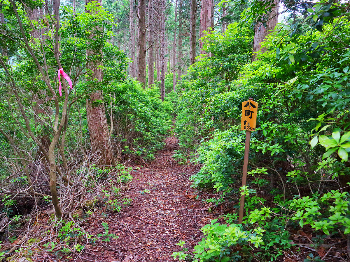 八町(距離:872m目)。ここから少しの間、両サイドの樹林に囲まれた道になる