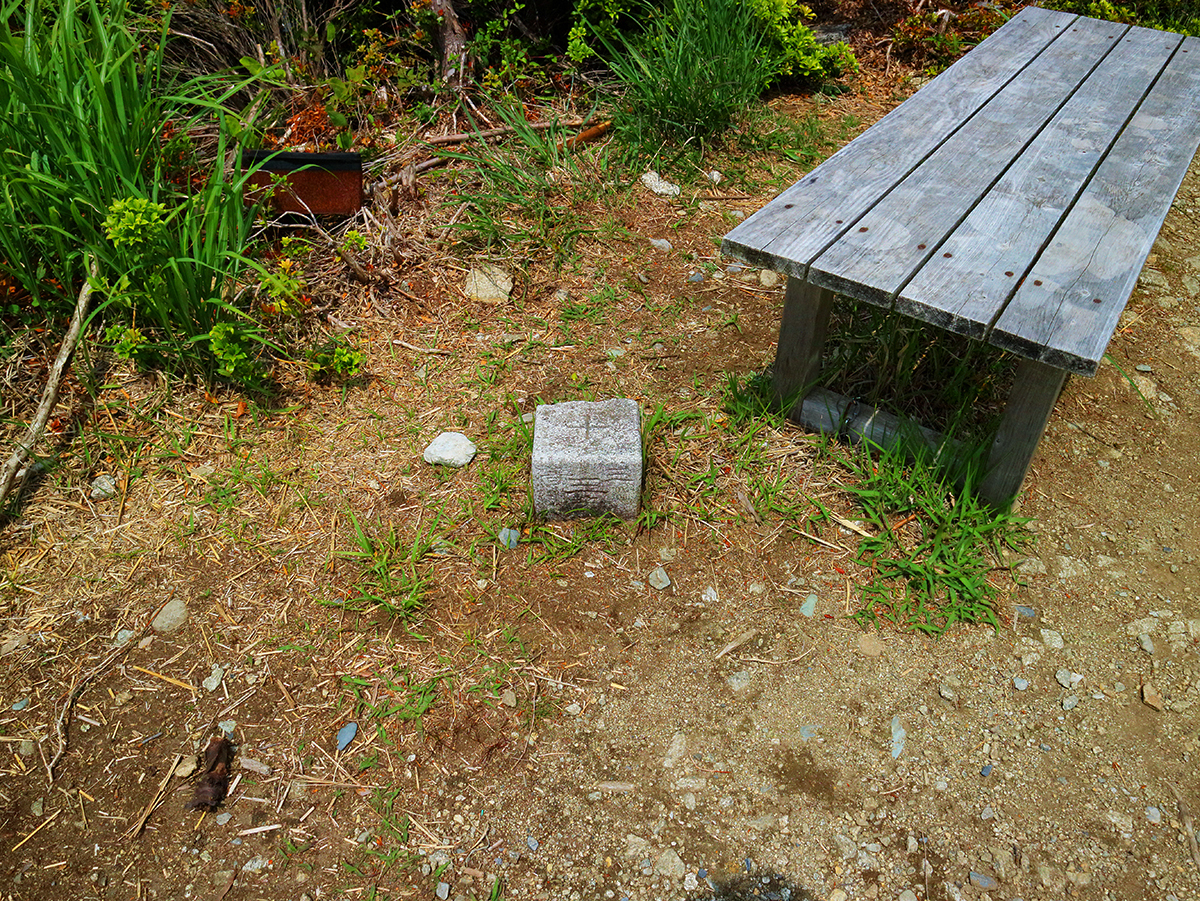 山頂に着いた時は気づかなかったけど椅子の下に山頂三角点があった。少し欠けてるけどね